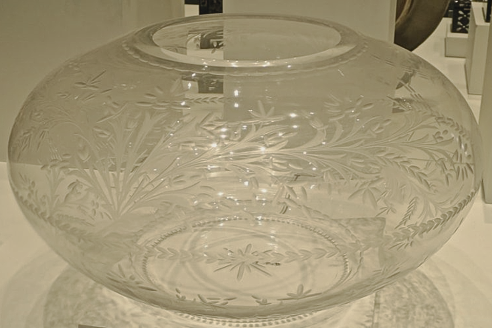 Evite la confusión, en primer lugar, el tema es bastante misterioso: este “cristal” se llama “de pepita”, pero no es un invento de una señorita Pepita; tampoco está necesariamente hecho de “cristal” – en el sentido técnico de “vidrio enriquecido con óxido de plomo [1]. La técnica, es lo que importa y lo que le da su nombre, puede ser perfectamente empleado en el vidrio ordinario. La “pepita” se refiere simplemente a la forma simple de una semilla de melón que el maestro vidriero graba en serie de rueda para formar patrones, tradicionalmente las flores, follajes, etc.