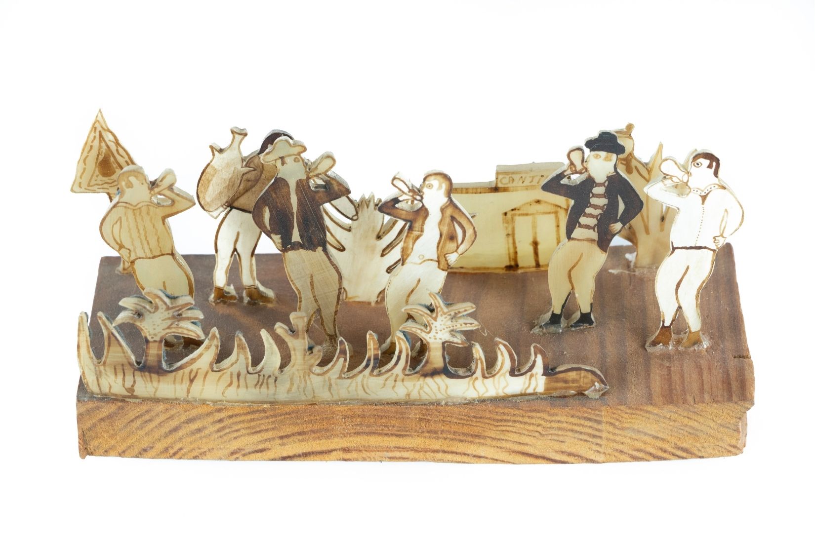 Bebedores de pulque. Piezas de cuerno recortado y esgrafiado sobre base de madera. Artesano desconocido. San Antonio de la Isla, EdoMex. Col. Ma. Teresa Pomar. (Foto: Estudio Kristina Velfu, EKV).