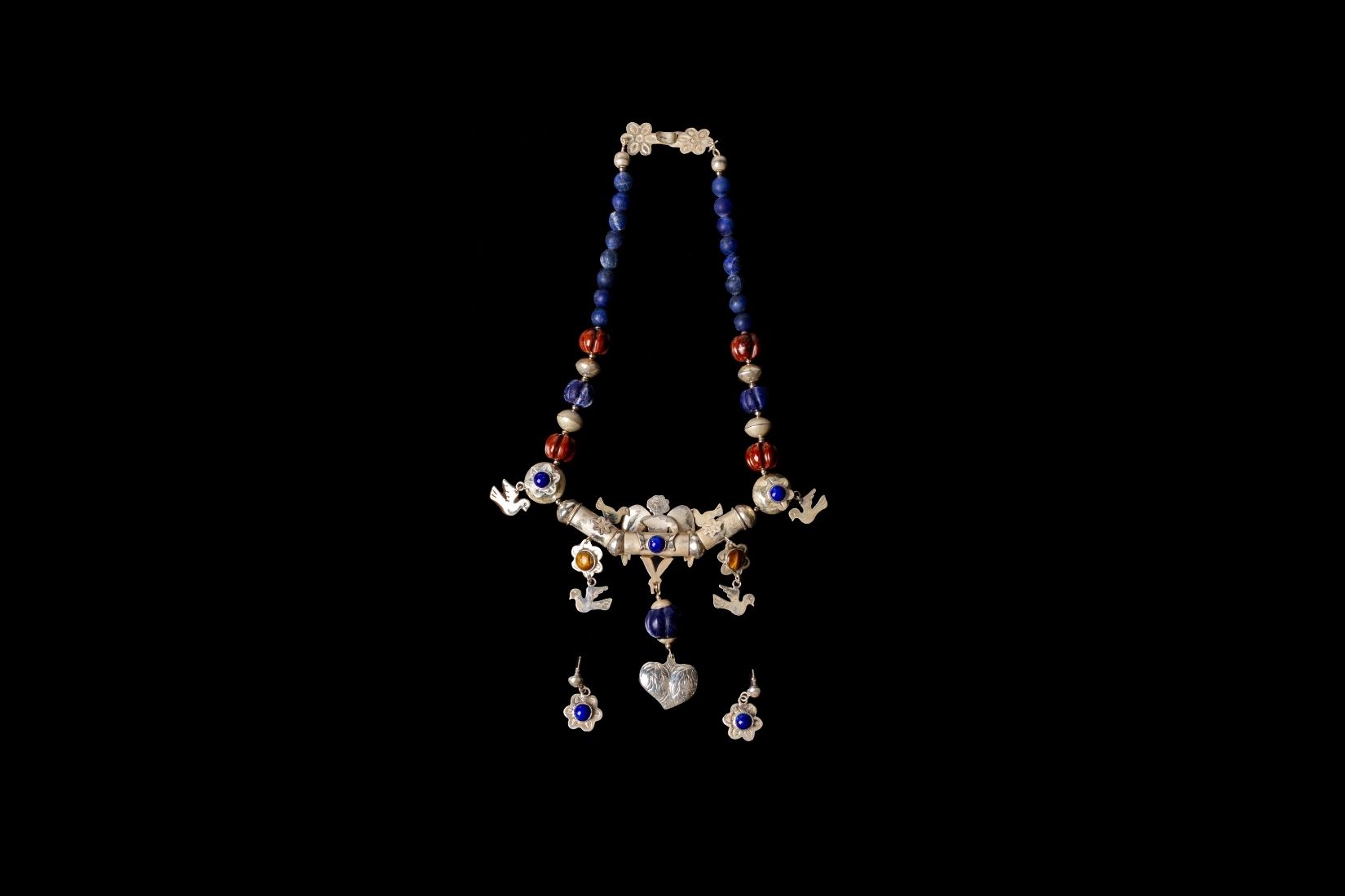 Collar y par de aretes de plata cincelada y embutida a mano. Artesanos Luis Alonso Espejel y Javier Pineda. CDMX. 1984. Donante Taller Hees. Col. AmigosMAP. (Foto: EKV).