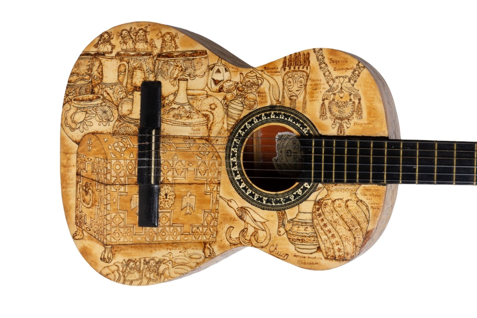 Artesanos de México, guitarra en madera pirograbada. Artesano Raymundo Guadiana Martínez. Ciudad de México. 2005. Col. Marie Thérèse Hermand de Arango. (Foto: EKV).