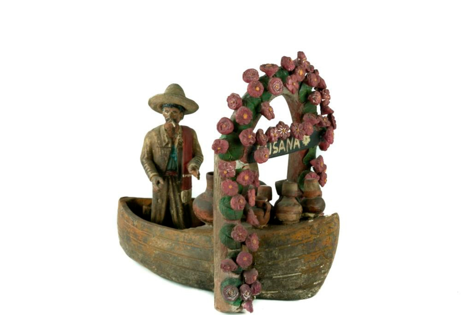 Trajinera con vendedor. Barro modelado y policromado. Artesano desconocido. Tlaquepaque, Jal. Col. Electra y Tonatihú Gutiérrez. Pieza donada a AmigosMAP. (Foto: EKV).