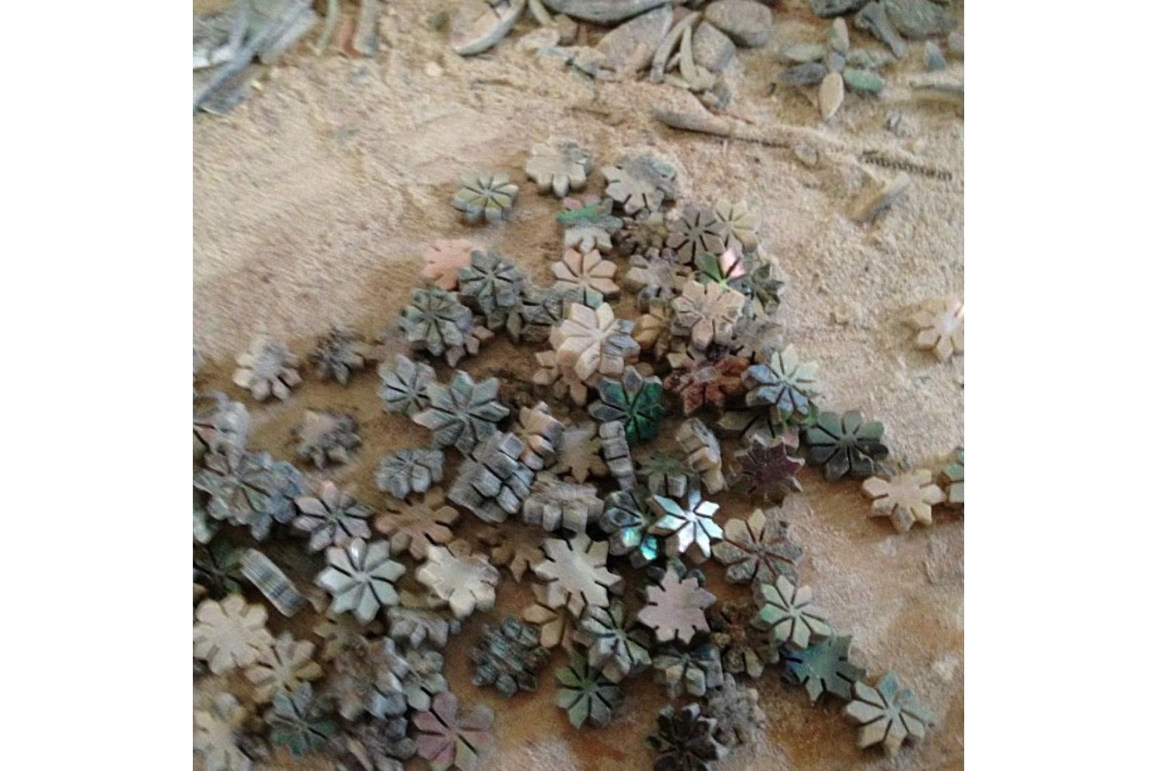 Mario comenzó su historia: Se dice que el trabajo de incrustación empezó alrededor del año de 1895, en el cual se creaba con huesos de animales. Dice que no era muy reconocido en la región y que donde más podían vender era en la capital del país. Ya casi se ha perdido este trabajo, en el año de 1950 la familia Pedraza se traslada a la Ciudad de México para poder comercializar sus piezas. Estando ahí, van al mercado de Sonora donde ven la concha de abulón y comienzan a crear sus piezas con esta. Vieron que le daba un valor muy especial a su artesanía y desde ahí se empezó a trabajarla en esta zona. Al principio fueron muy reservados con su trabajo, pero por la demanda que tenían, comenzaron a contratar y a enseñar a más artesanos sus técnicas de fabricación; uno de los que heredó esta maravillosa técnica fue el mismo Mario Gerardo Jagüey, el hoy posee su taller, en el cual, junto a su esposa y su familiar crean estas maravillosas piezas. Nos dice que aproximadamente veinte familias más trabajan este tipo de artesanía, y con ellos el rescate de la misma.
