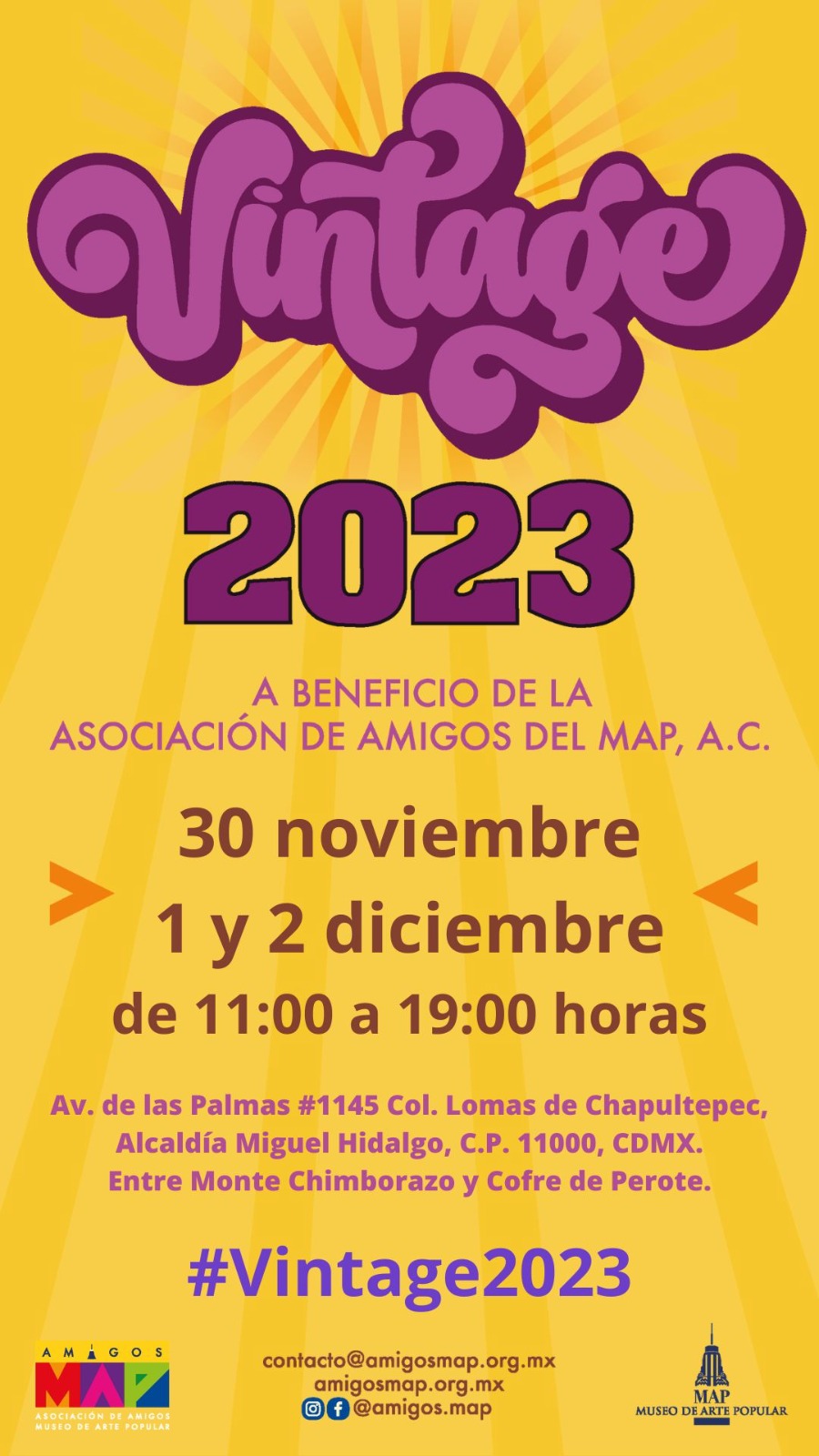 Nos da mucho gusto compartirles que la Asociación de Amigos del MAP, A.C., organizará el tradicional evento “VINTAGE” este 2023, se llevará a cabo los días 30 de noviembre, 1 y 2 de diciembre, en Av. de las Palmas No. 1145, Col. Lomas de Chapultepec, C.P. 11000, Ciudad de México.