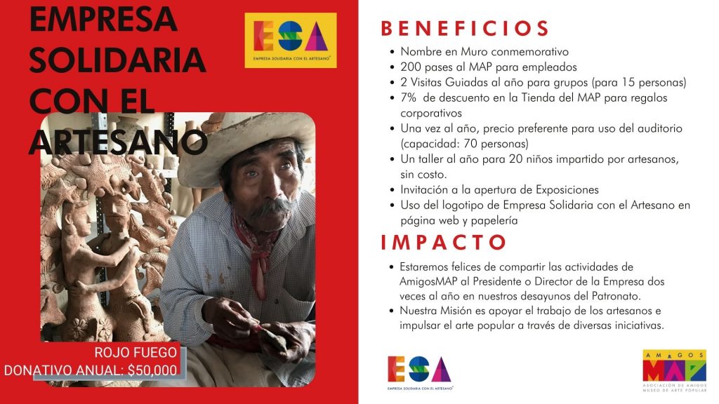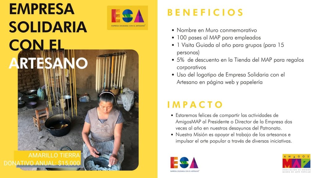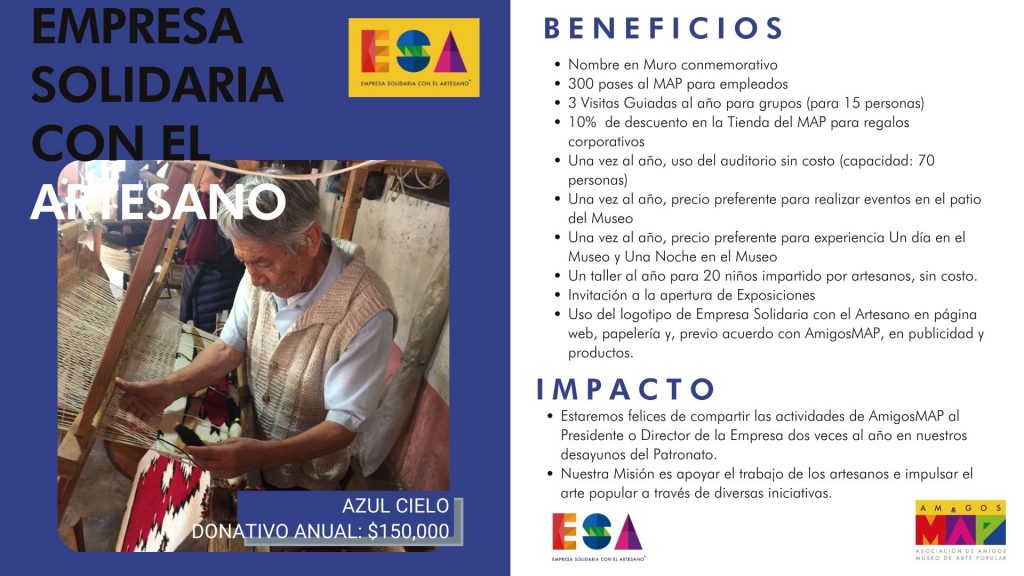 Con nuestro programa Empresas Solidarias con el Artesano (ESA®), buscamos impulsar y poner en movimiento la valoración y solidaridad por el arte popular y los artesanos de nuestro país.