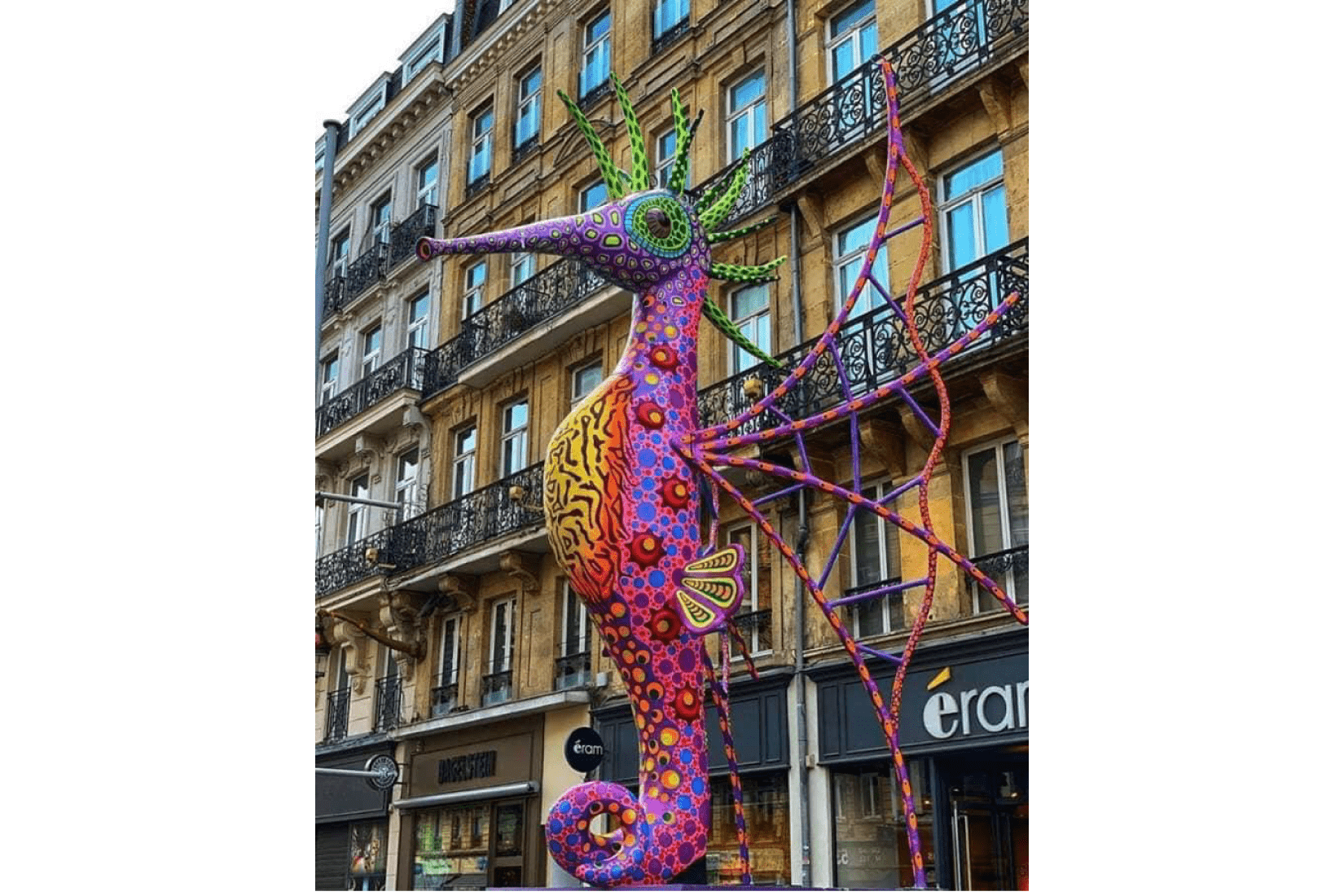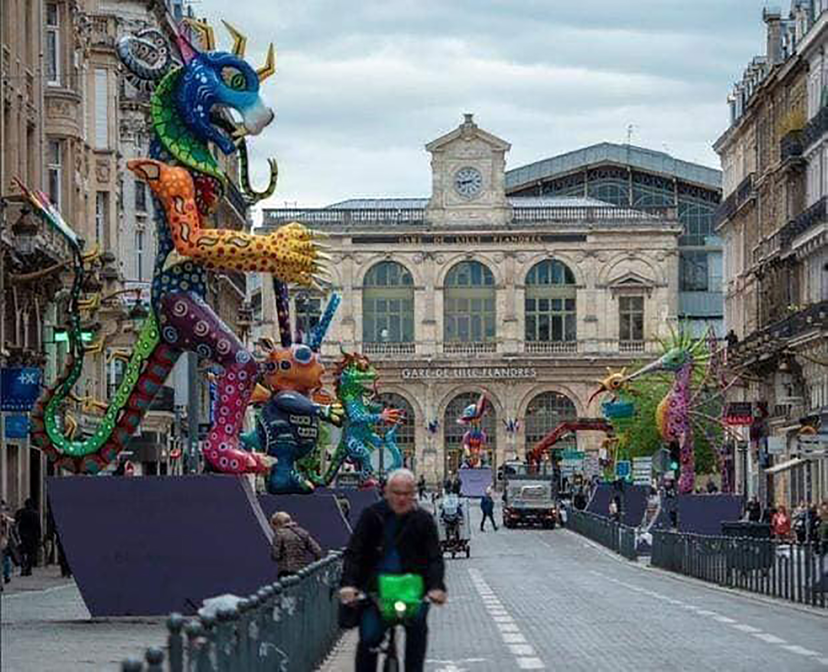 Caminar por la ciudad de Lille es una experiencia de una línea histórica muy antigua, que va desde los primeros asentamientos celtas 2000 años a.c., pasando por la Galia Romana, la Edad Media con el Condado de Flandes, después en el Renacimiento con el gobierno de los duques de Borgoña hasta que en el siglo XVII el rey francés Louis XIV la ocupa y la convierte en territorio francés hasta la fecha. Todos esos pasos históricos se ven perfectamente plasmados en toda la traza de la antigua ciudad y en sus edificios de piedra que gozan de tener diferentes estilos en uno mismo dependiendo de la época que vivió la ciudad. Y de repente en 2019, en tu andar por esas calles angostas en donde todo tiene su lugar fijo y establecido, brota una variedad de colores vivos mexicanos, el papel picado que baila al ritmo del viento atravesando las calles; las vitrinas de los pequeños comercios se ven embellecidos por diferentes piezas de arte mexicano como las calaveras de muertos de azúcar, chocolate o de cerámica, las piñatas, las máscaras de tigres, flores de papel maché. Las tiendas de pasteles y chocolates locales combinan el colorido de sus golosinas con el de la enorme variedad de los dulces mexicanos. En las largas avenidas los visitantes se quedan pasmados al ver las magníficas y monumentales esculturas de alebrijes de Paco Enriquez y de Jesús Sanabria, o el magnífico Quetzal resplandeciente de Julien Salaud o los coloridos cráneos gigantes, los ¨Mexicraneos¨ de la Sociedad de las Pompas Fúnebres Mexicanas. El Viejo edificio de la Bolsa abraza los ¨Soles de Oro¨, espejos místicos, soles con reflejos de oro de Betsabée Romero y en el Patio del Museo del Hospicio de la Condesa se aprecia su ¨Requiem por la Ciudad de los Canales¨ decorando el patio con múltiples trajineras de Xochimilco.
