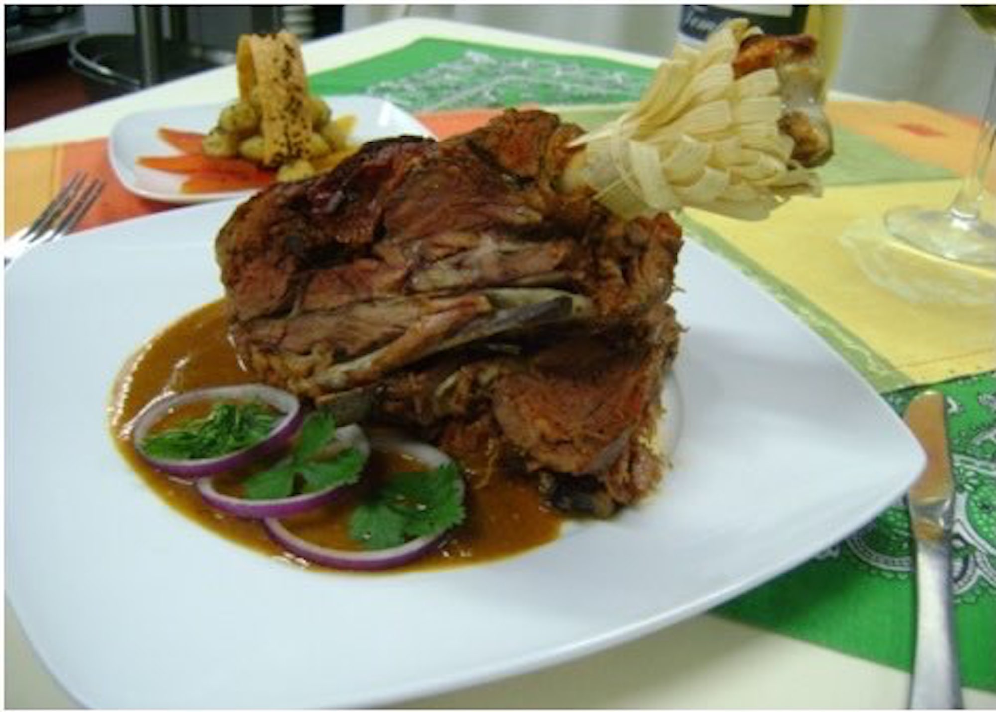 Espaldilla de cordero tatemada con salsa de chile morita y papas al romero