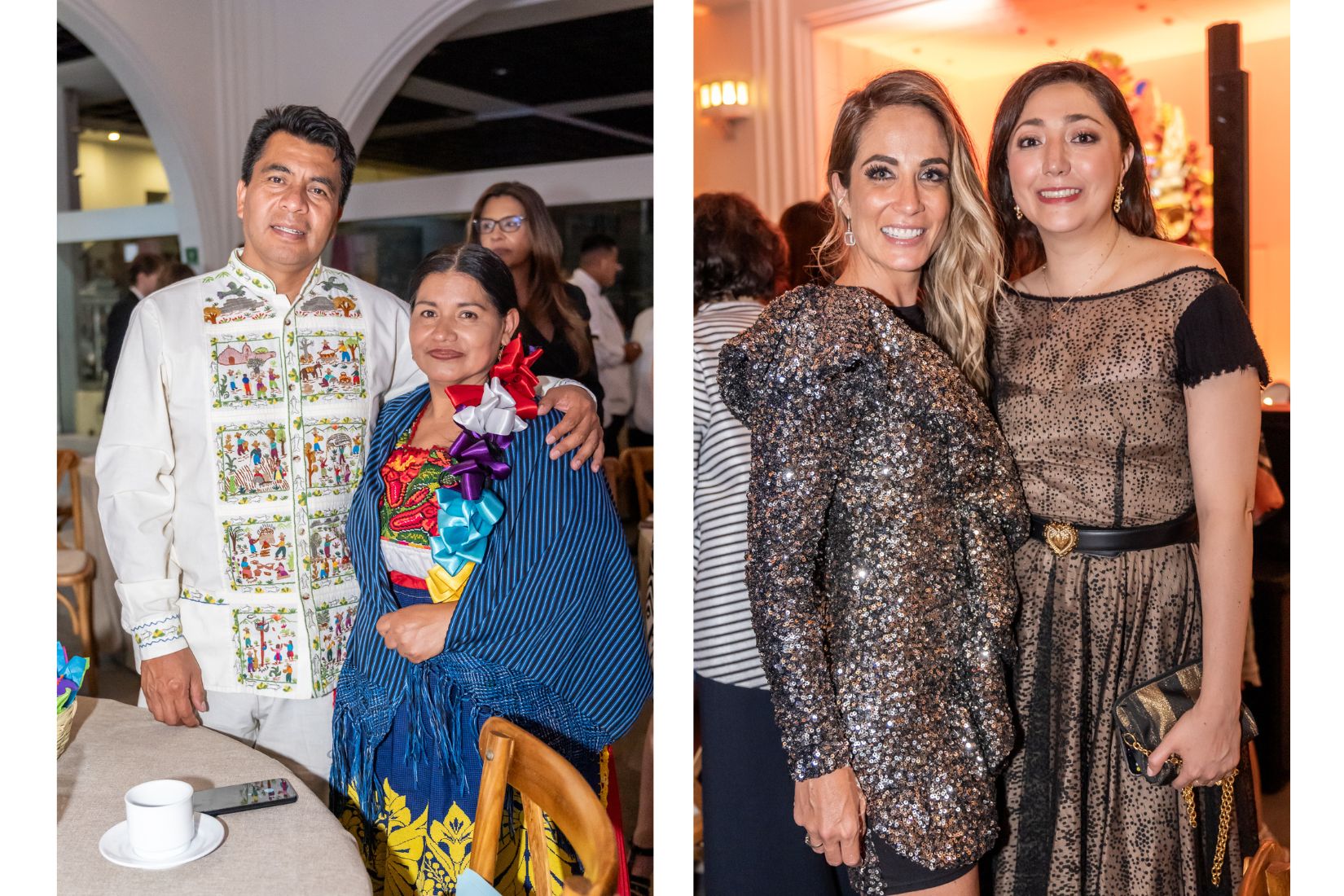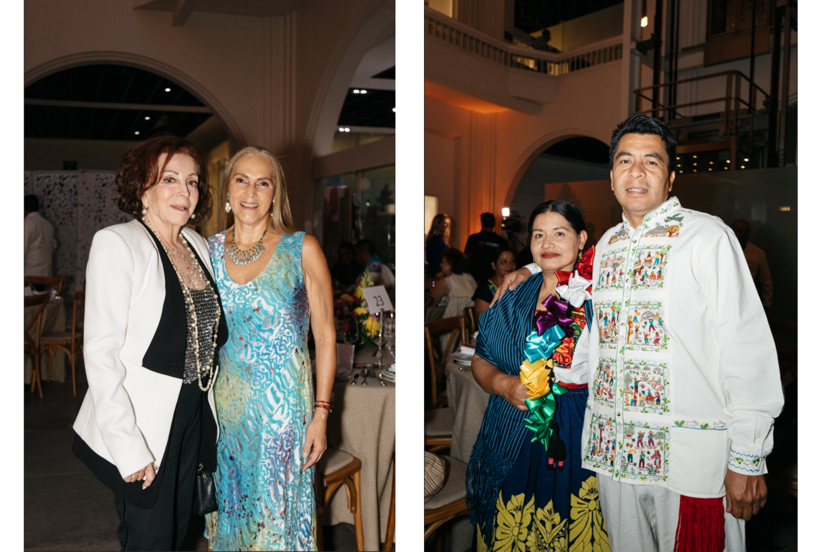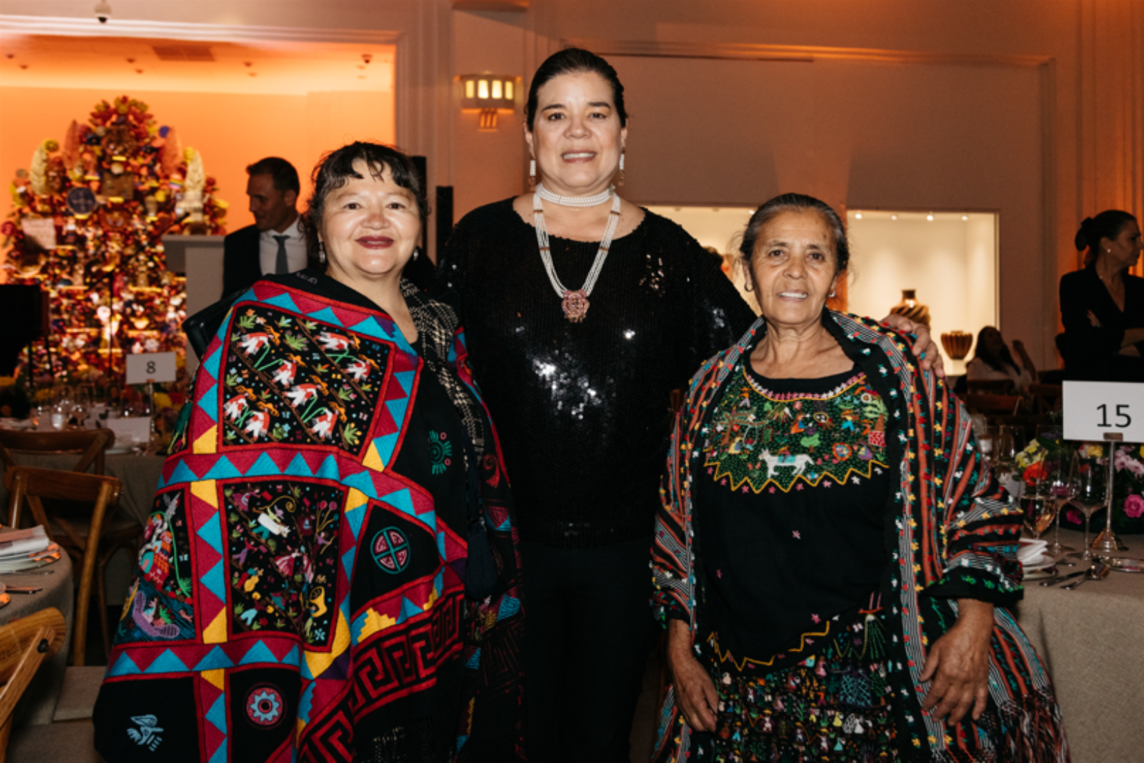 Teofila Servin y Bertha Servín, artesanas de bordado de Tzintzuntzan, Michoacán junto con Sonya Santos en el 25 Aniversario de AmigosMAP. (Foto: AGBA Weddings)