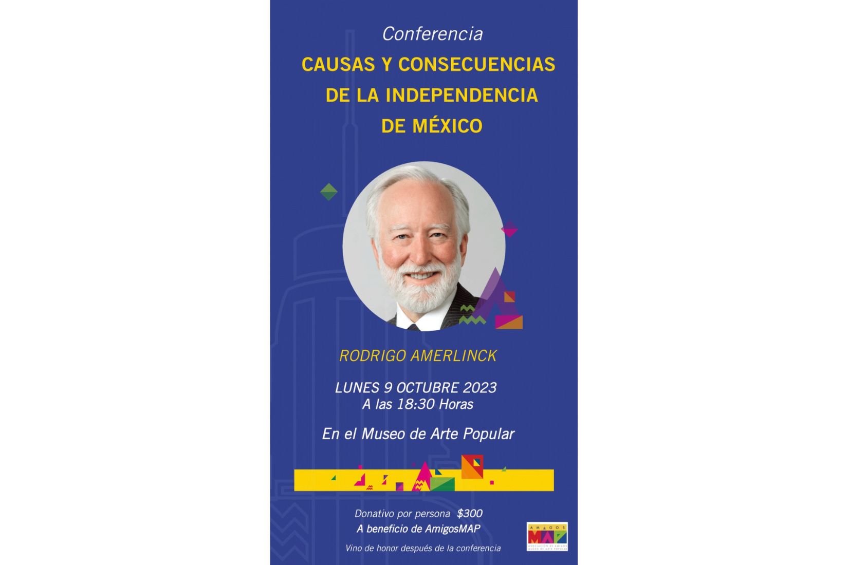 El 9 de octubre de 2023 se llevó a cabo la conferencia Causas y consecuencias de la Independencia de México con el escritor Rodrigo Amerlinck en el Museo de Arte Popular.