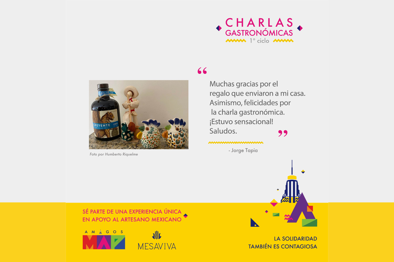 Los inscritos, además de aprender de las pláticas también recibieron un recetario digital con videos de las recetas, un playlist especialmente curado para acompañar la preparación de los platillos y un kit con una botella de mezcal creyente, latas de atún Tuny y una pieza de arte popular relacionada con la gastronomía.