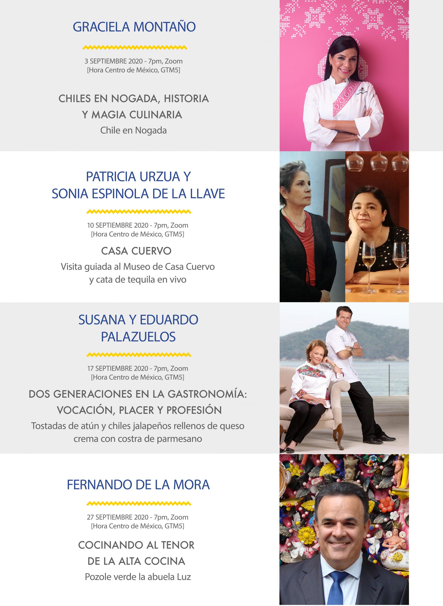 Desde su propio espacio los chefs invitados nos deleitaron con recetas únicas y tradicionales, tuvimos una visita guiada virtual a las instalaciones del Museo Casa Cuervo y una cata de tequila donde los participantes desde sus casas podían seguir con el kit que les enviamos previamente, por último, contamos con la participación del talentoso tenor Fernando de la Mora, quien además de compartir una deliciosa receta de pozole verde, deleito a los participantes con una interpretación a capella.
