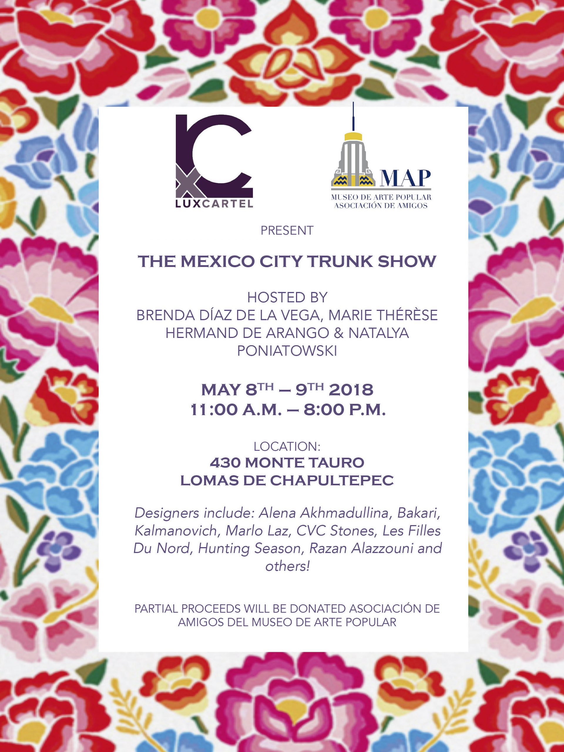 Una de las empresas interesadas en apoyar a los AmigosMAP, para cumplir con nuestra misión de promover el arte y la cultura de México, es Lux Cartel Inc., con quienes el martes 8 y miércoles 9 de mayo de 2018, se llevó a cabo el evento Mexico Trunk Show, una venta a beneficio de la Asociación de los Amigos del MAP, A.C.