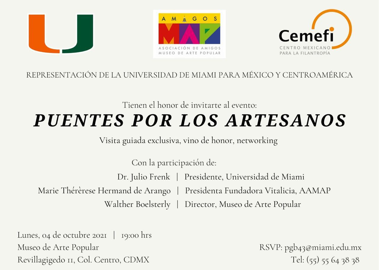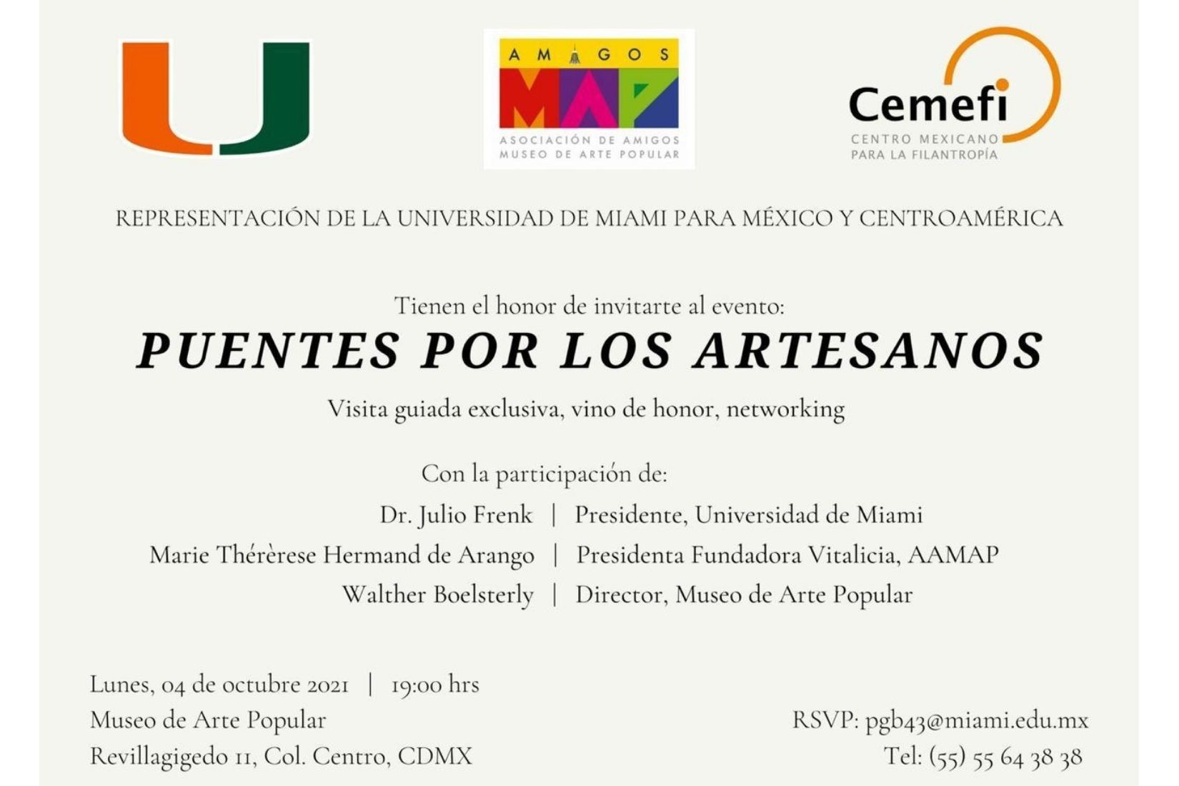 El pasado lunes 04 de octubre de 2021, La Asociación de Amigos del MAP A.C. (AmigosMAP) y la Universidad de Miami (UM) -a través de su Representación para México y Centroamérica-, fueron los anfitriones de “Construyendo puentes por los artesanos”, un evento enfocado a ayudar a los artesanos y sus comunidades, uno de los gremios más afectados por la pandemia; así como a promover el intercambio cultural.