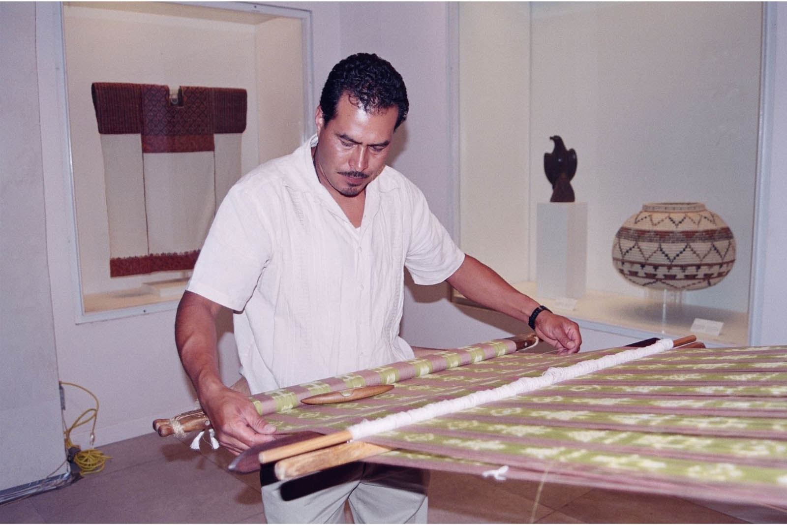 Artesano tejiendo en telar de cintura en la presentación del libro Arte del Pueblo, Manos de Dios en el Museo de Arte Popular. (Foto: AmigosMAP).