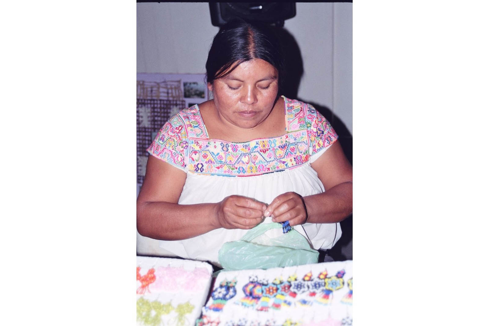 Artesana tejiendo joyería de chaquira en la presentación del libro Arte del Pueblo, Manos de Dios en el Museo de Arte Popular. (Foto: AmigosMAP).
