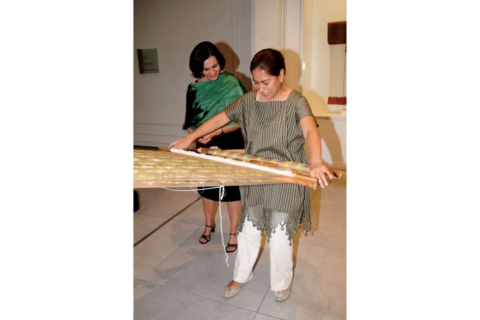 Guadalupe de Vázquez Mota y artesana tejiendo en telar de cintura en la presentación del libro Arte del Pueblo, Manos de Dios en el Museo de Arte Popular. (Foto: AmigosMAP).