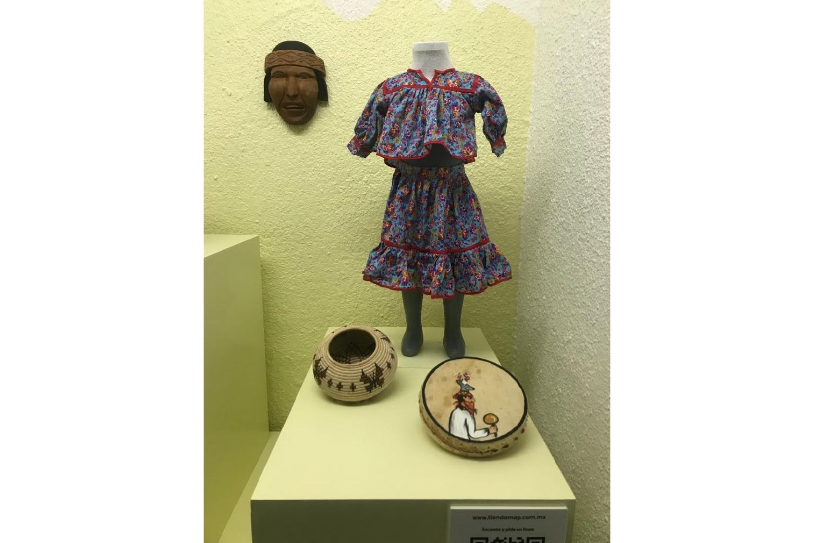 - La exposición del MAP presenta, de la zona norte, el talento de artesanos de Sonora y Chihuahua, mediante una máscara rarámuri, tallada manualmente en madera de cedro; un tambor de cuero pintado a mano con elementos de la cultura Yaqui y un traje rarámuri de tela cosida, entre otros.