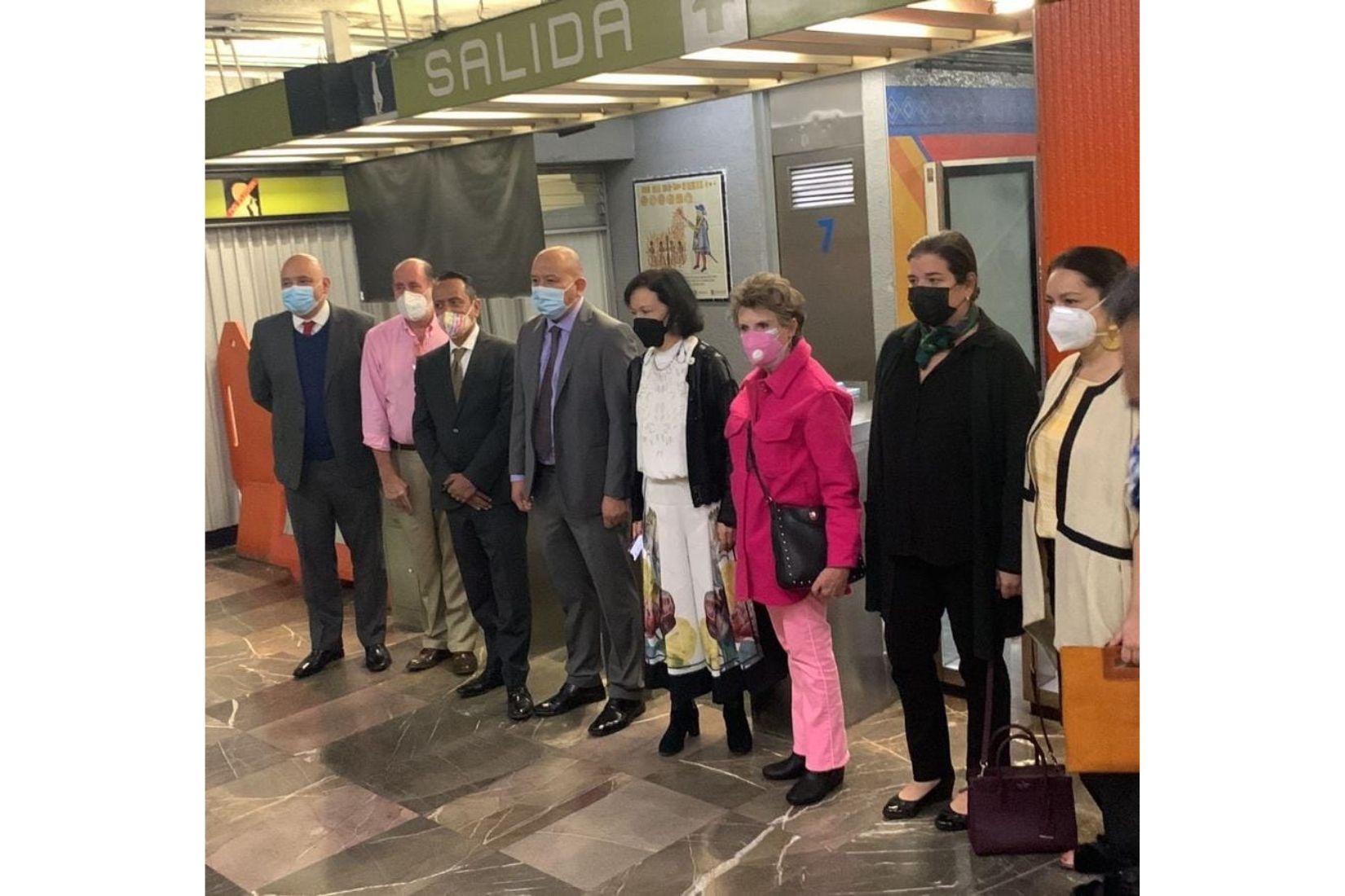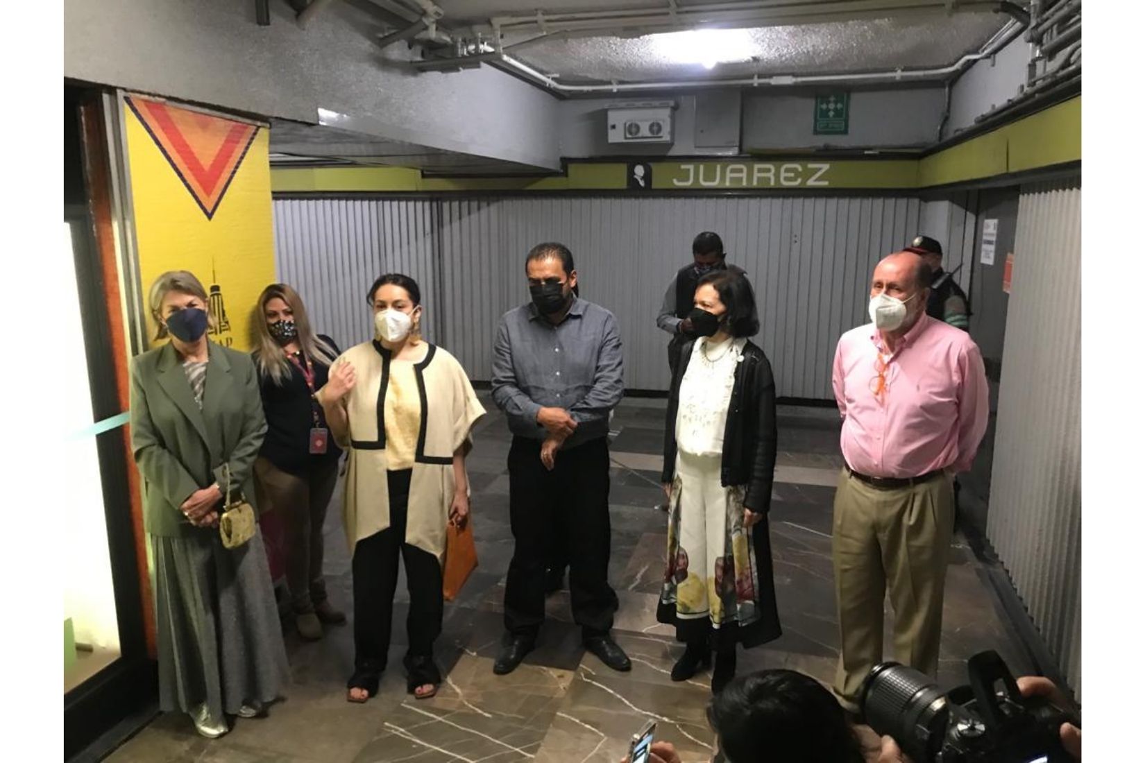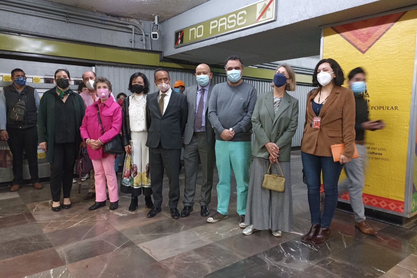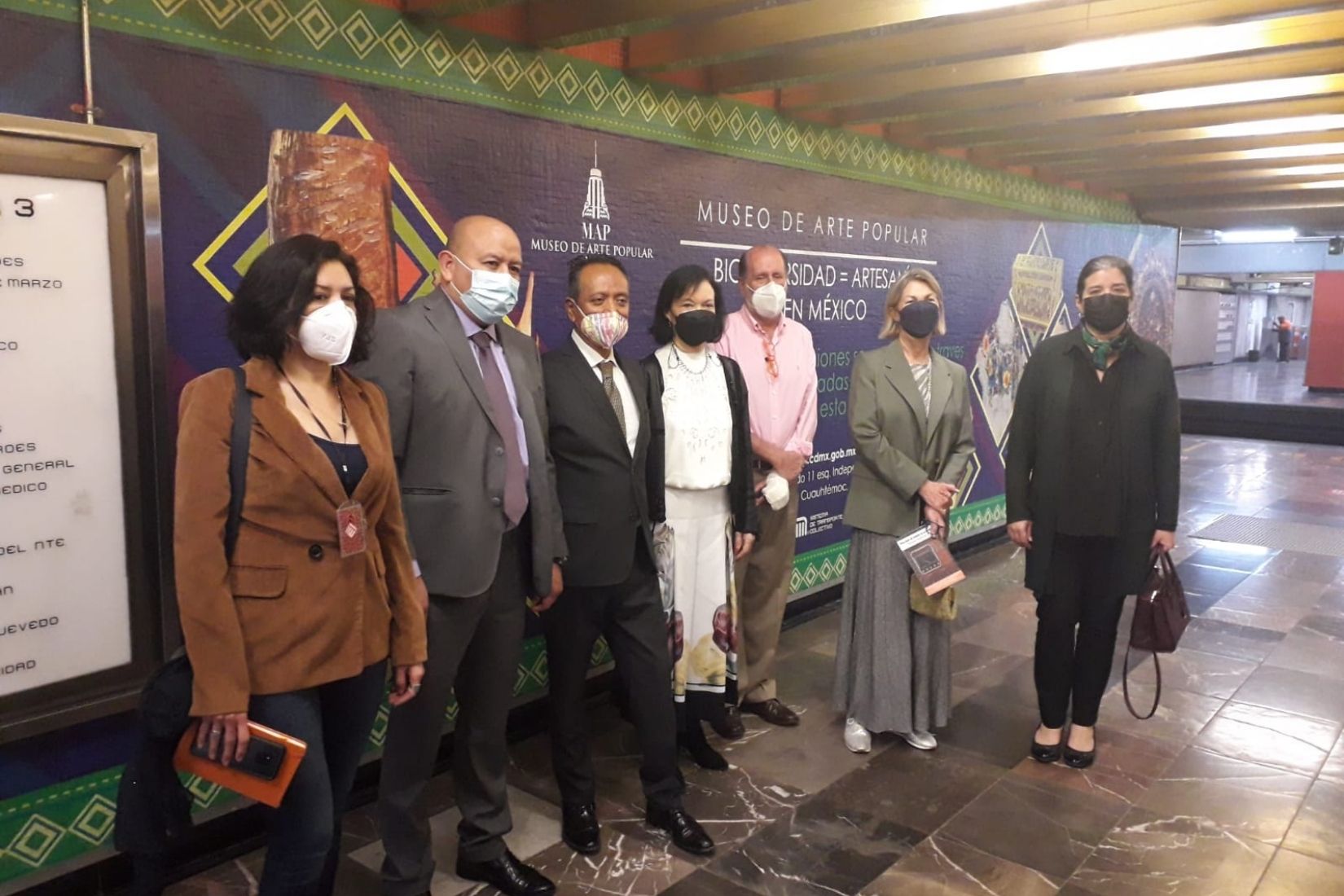 Sonya Santos, Walther Boelsterly, Maureen Spilk, Cecilia Moctezuma, Jaime López Vela, Julio Iver Martínez, David Sánchez y Marie Thérèse Hermand de Arango en inauguración de vitrinas en Metro Juárez. (Foto: AmigosMAP).