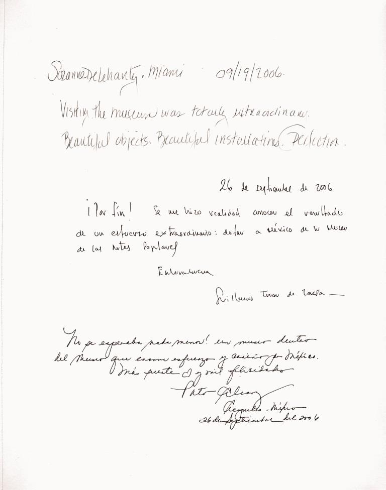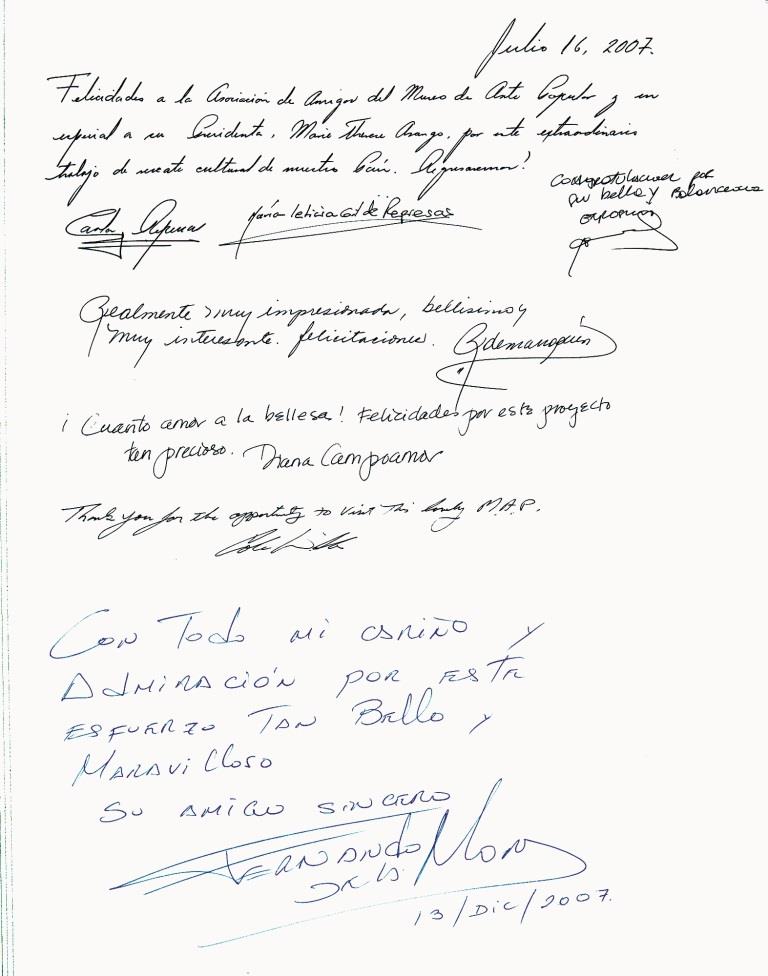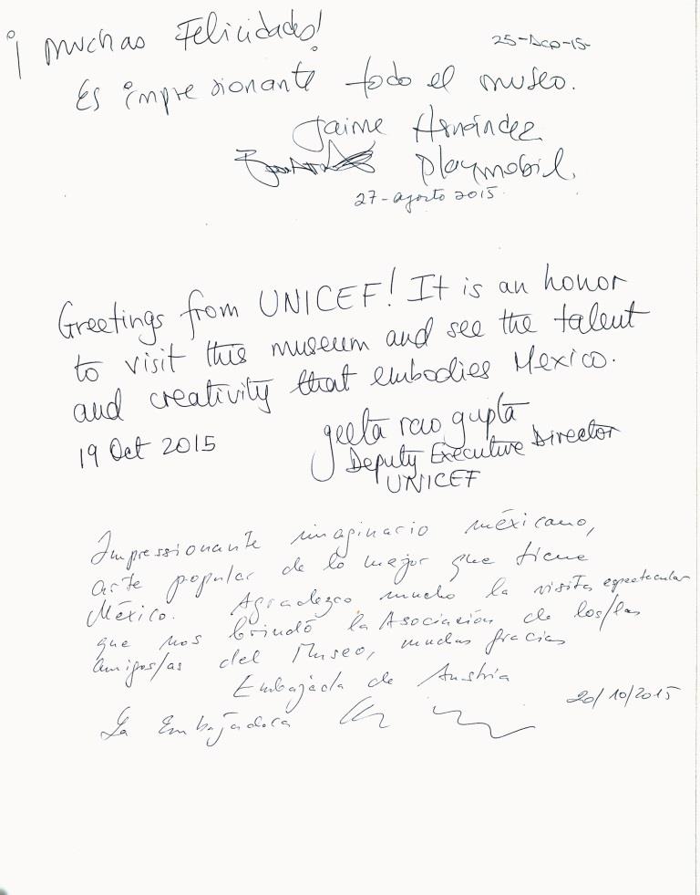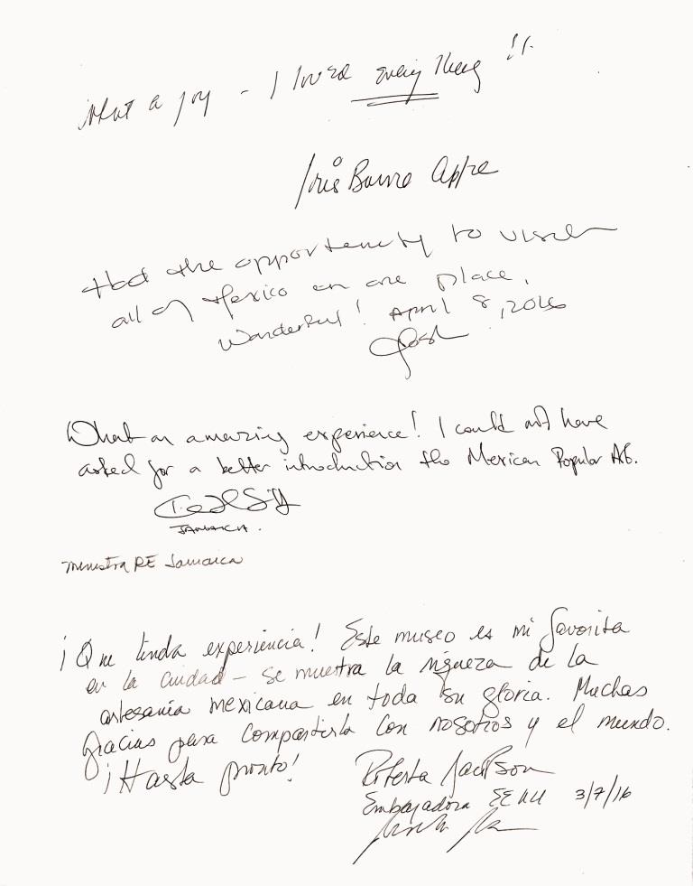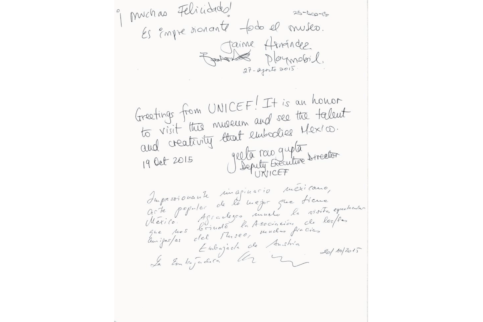 Con el objetivo de guardar registro de las personalidades que han visitado el MAP, se les pide dejar algún comentario y su firma en el libro de visitantes distinguidos, donde personalidades como Gabriel García Márquez, Carlos Fuentes, Guillermo del Toro, entre muchos otros, han dejado su firma y memorias de su visita al Museo de Arte Popular.