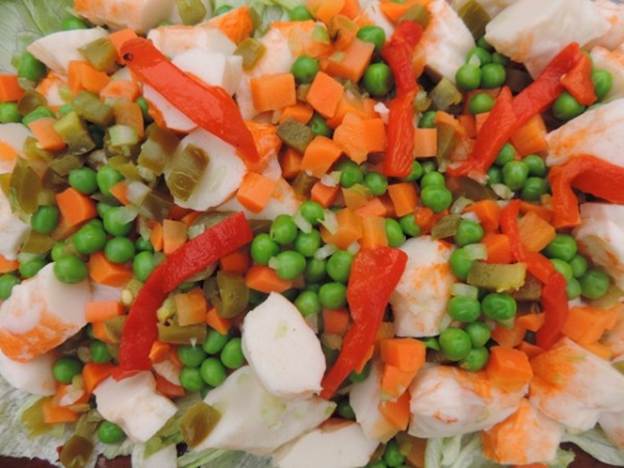 Mezclar en un recipiente todos los ingredientes, menos la lechuga y el morrón. Hecha la ensalada, acomodarla en un platón sobre hojas de lechuga y adornarla con tiritas de pimiento morrón.