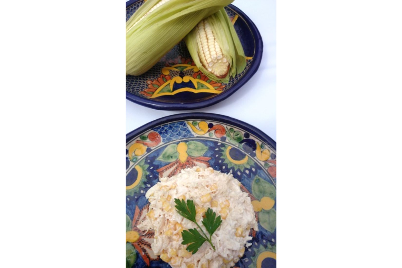 Pollo con elote y crema: la carne cocida y desmenuzada se guisa con ajo y cebolla, granos de elote y jitomate; se coloca en capas dentro de un molde, alternadas con rajas de poblano y pimiento morrón; se baña con crema y se hornea.
