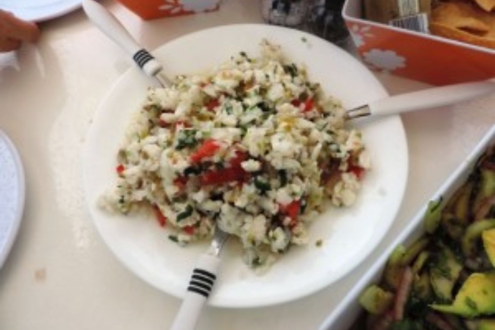 Ceviche acapulqueño, donde el pez sierra se cuece en limón y se adereza con cebolla, jitomate y aguacate.