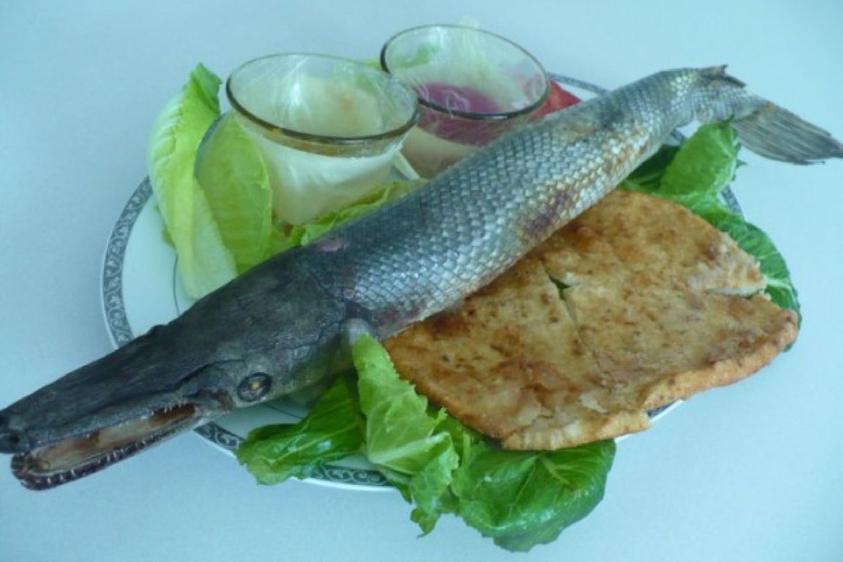 Con el prediluviano pejelagarto, en los mercados hacen tacos dorados con el pescado asado y desmenuzado, frito con cebolla y jitomate. Por supuesto, se les agrega alguna salsa picante.