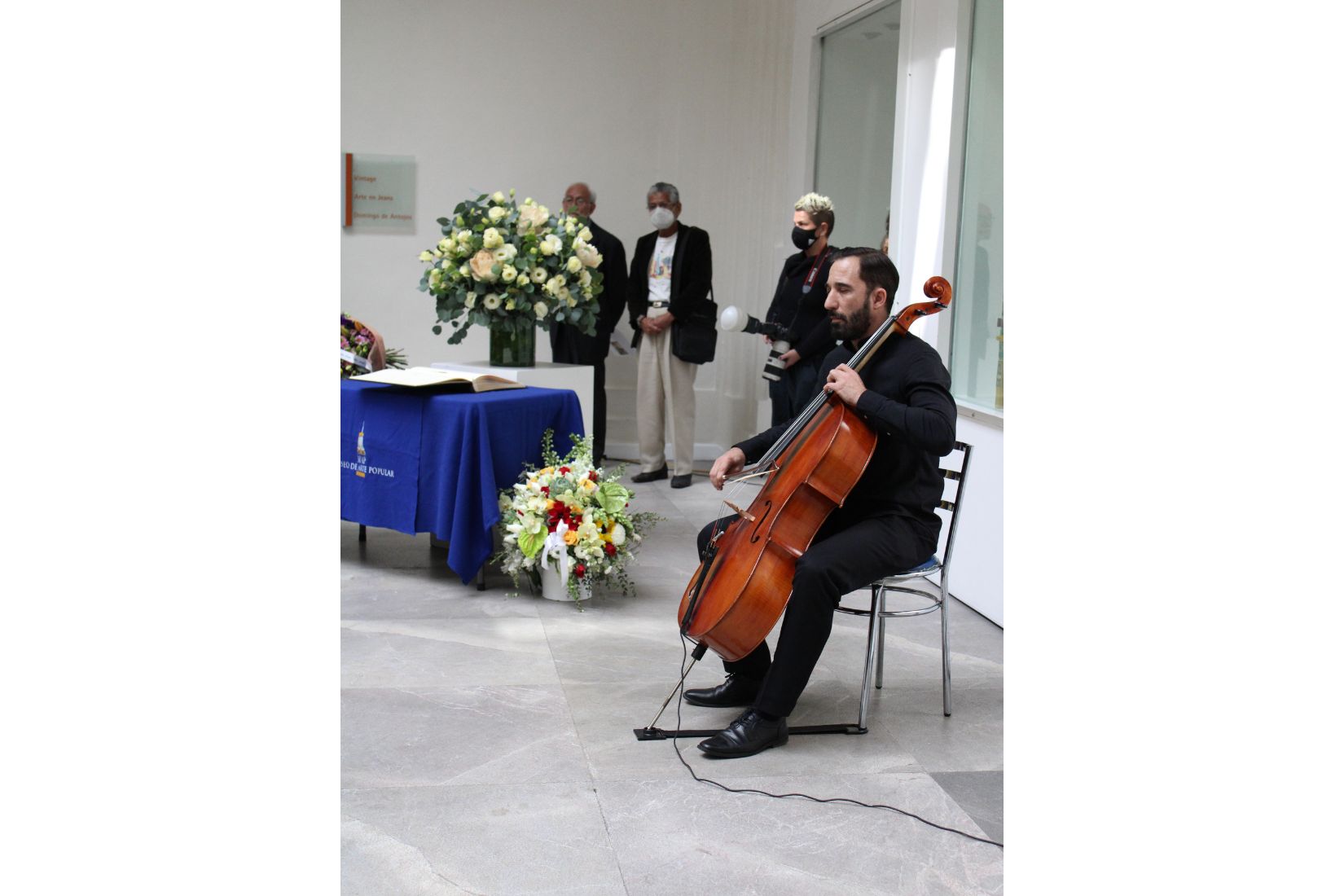 El evento contó con la participación del chelista Rodrigo Díaz quien interpretó la Elegia de Fauré y enseguida el reconocido ceramista Ángel Santos, quien conoció a Marie Thérèse, dirigió unas palabras y dedicó una obra para la Familia Arango.
