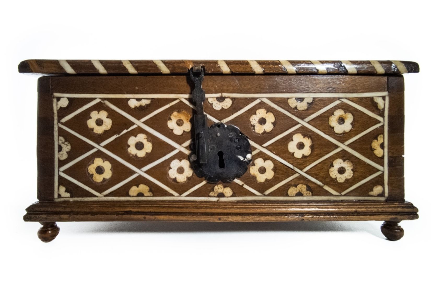 Caja de madera con incrustación de hueso. Artesano y procedencia desconocidos. Col. Marie Thérèse Hermand de Arango. (Foto: Patricia Suárez).
