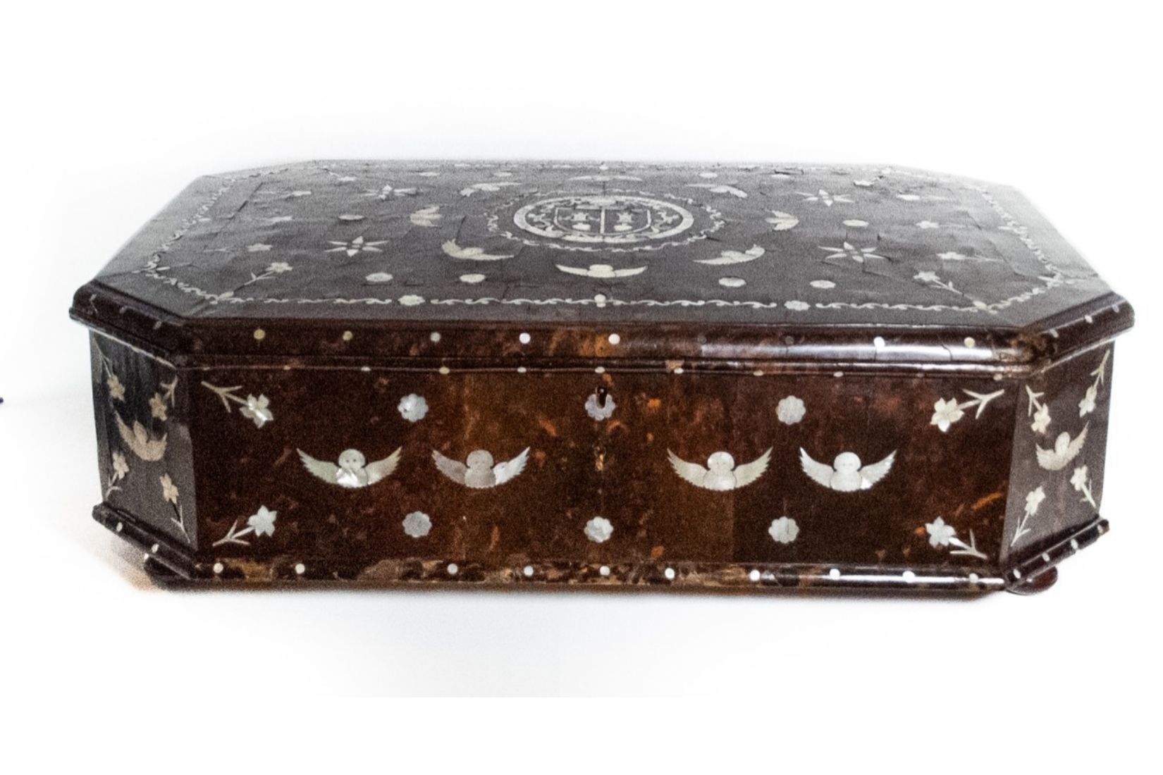 Caja de madera con incrustación de concha nácar y carey. Artesano y procedencia desconocidos. S. XVIII. Col. Rodrigo Rivero Lake. (Foto: Jasso).