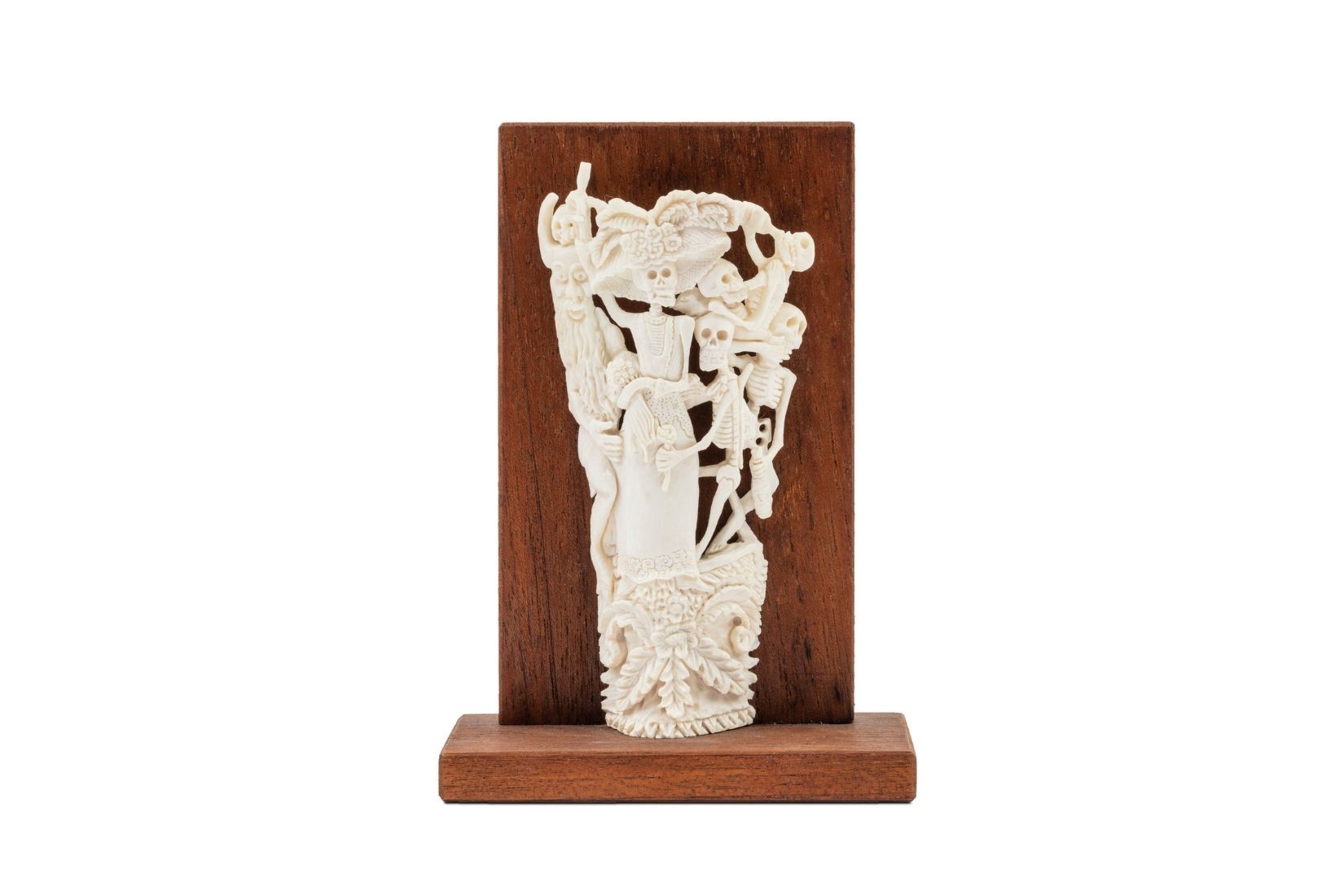Catrina, diablo y calaca. Talla en hueso. Artesanos Roberto y José Manuel Ruiz. Nezahualcóyotl, EdoMex. Col. Miguel Abruch. (Foto: GLR Estudio).