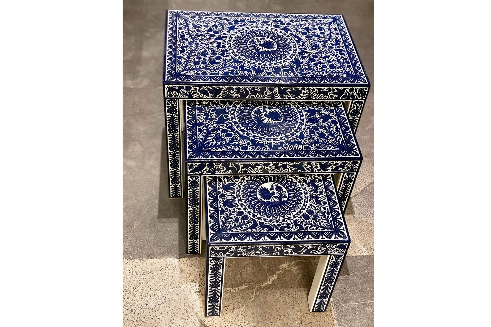 Juego de 3 mesas de laca rayada. Artesano Esteban Ayala. Olinalá, Gro. Tienda MAP.