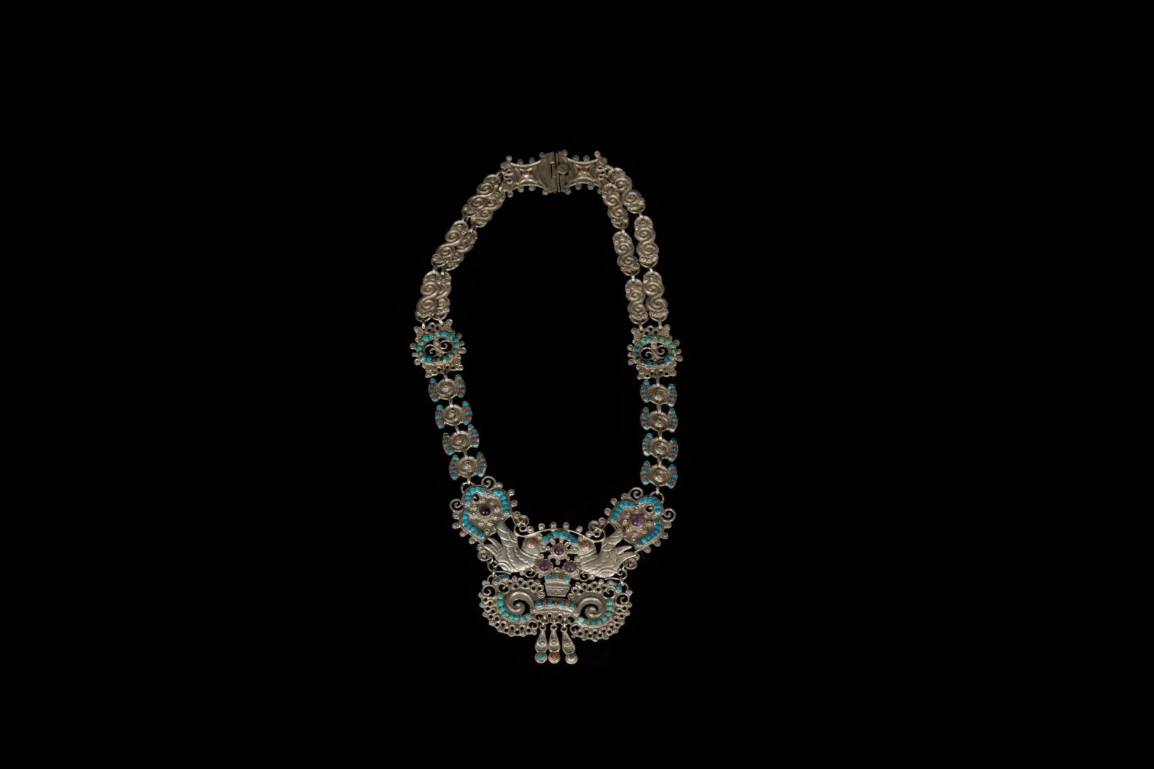 Collar de plata cartoneada con turquesa, amatista y coral engarzados. Artesanos Arte en Plata MATL. Donantes Rosalía y Ricardo Salas Poulat. Col. AmigosMAP. (Foto: EKV).