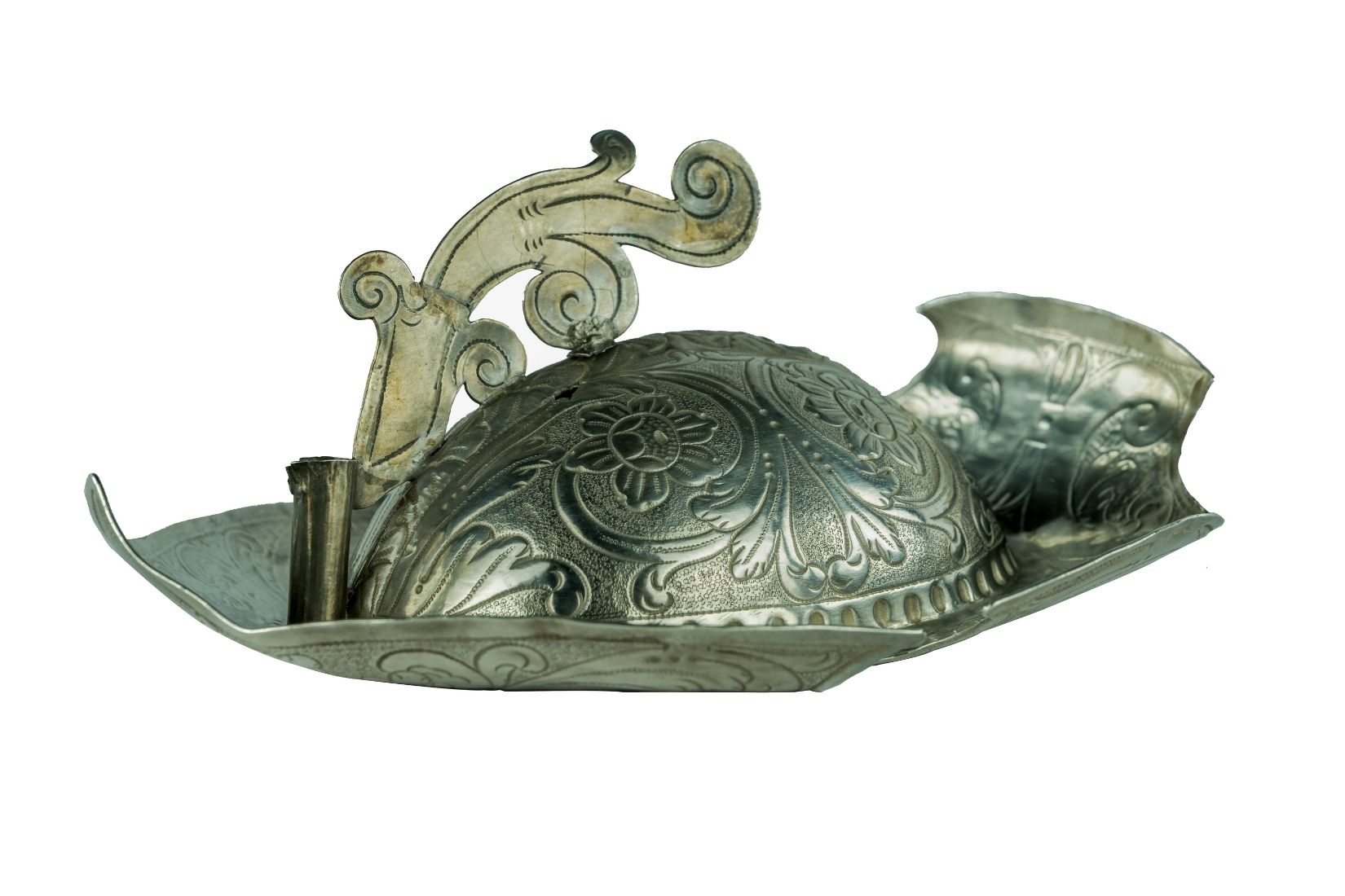 Casco de conquistador de plata forjada y grabada en relieve. Artesano y procedencia desconocidos. Col. Rodrigo Rivero Lake. (Foto: EKV).