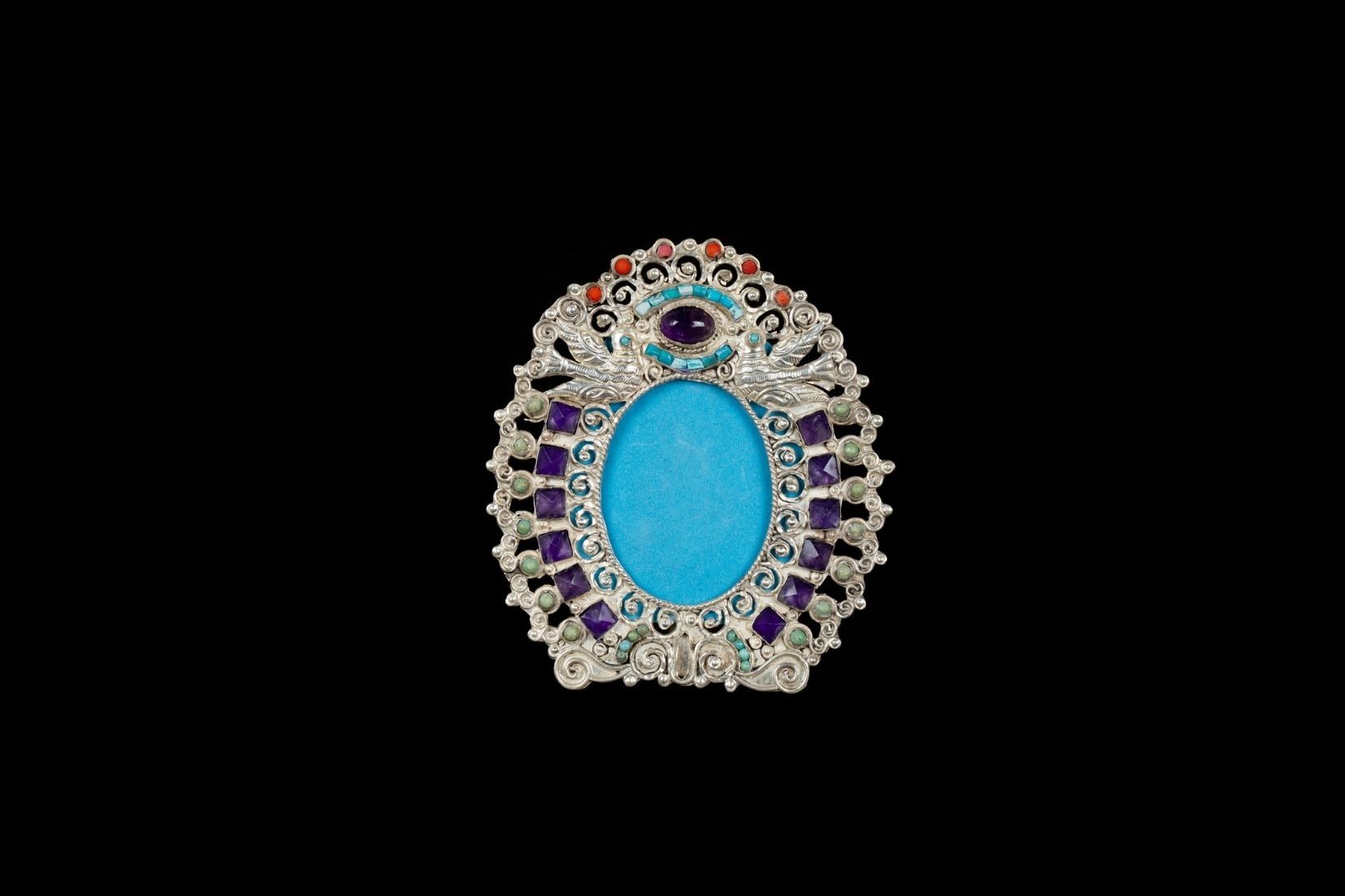 Broche Imperial. Plata cartoneada con incrustaciones de turquesa, amatista y coral. Artesanos Arte en Plata MATL. Donantes Rosalía y Ricardo Salas Poulat. Col. AmigosMAP. (Foto: EKV).