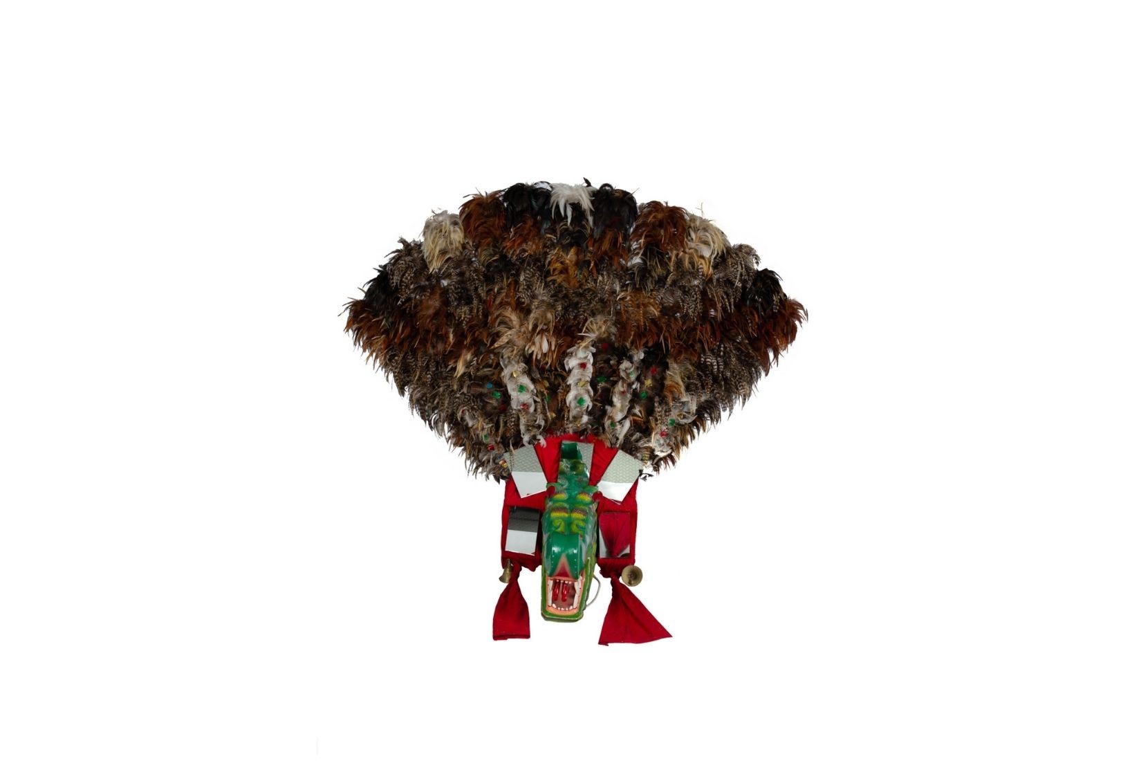 Penacho de plumaria con cabeza de serpiente de madera y espejos. Artesano y procedencia desconocidos. Col. María Teresa Pomar. (Foto: Estudio Kristina Velfu, EKV).