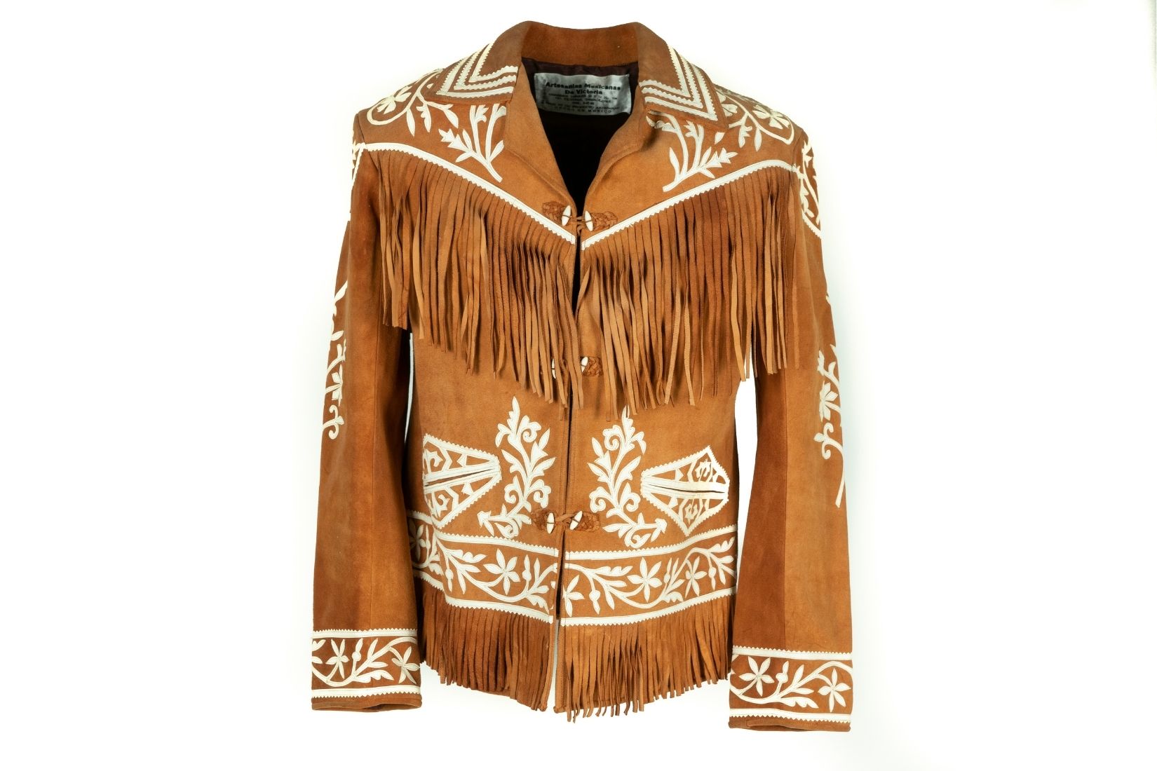 Chamarra de piel de gamuza con aplicaciones de piel blanca. Artesanías Mexicanas de Victoria. Cd. Victoria, Tamps. Col. Part. (Foto: EKV).