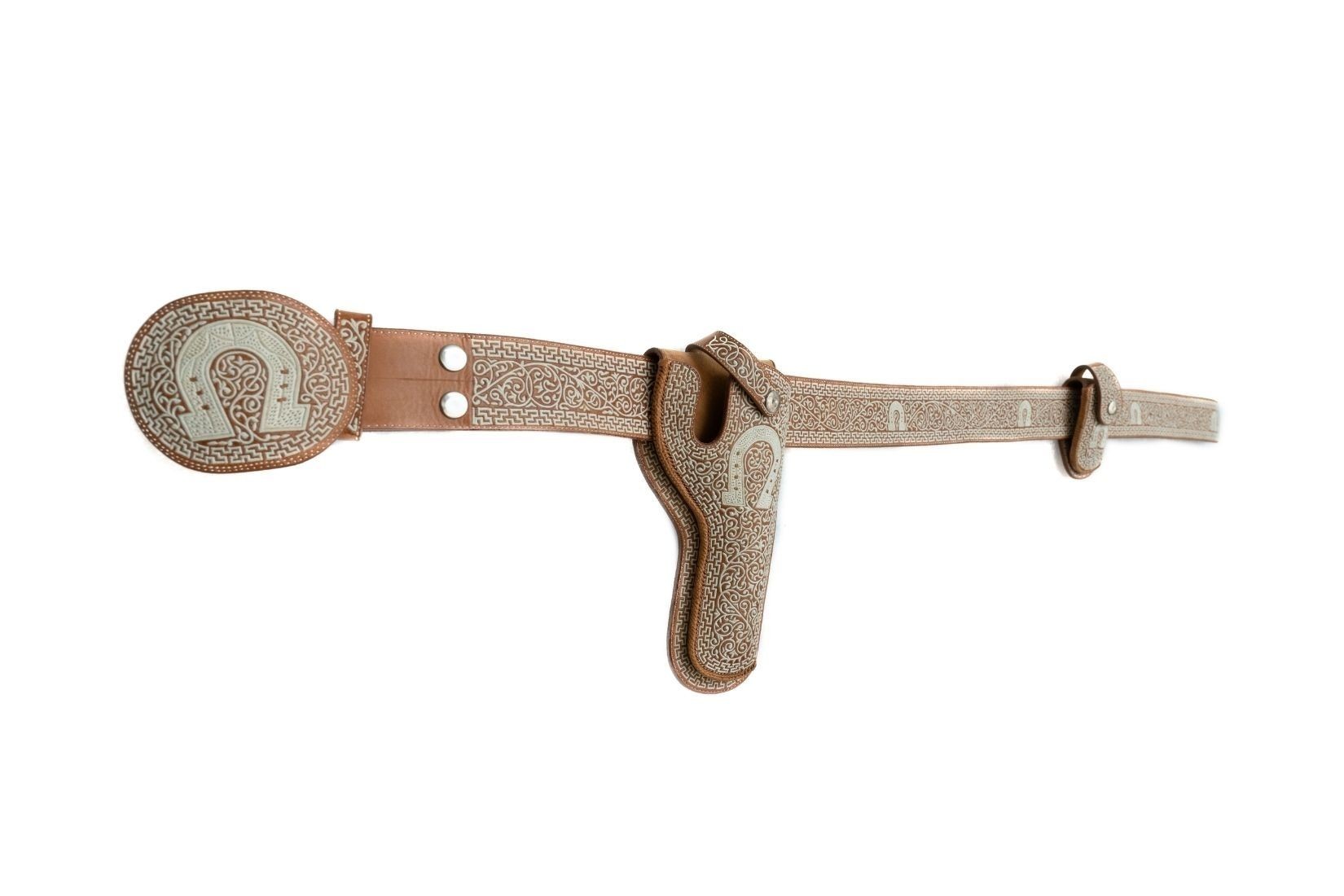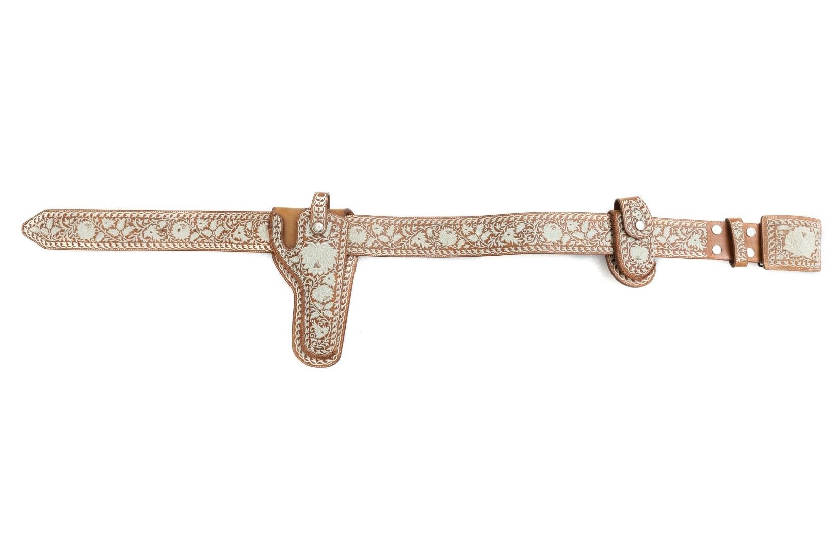 Fornitura piteada. Piel curtida y bordada con pita. Artesano Francisco Martínez Balderas. Tlalnepantla, EdoMex. Col. Part. (EKV).