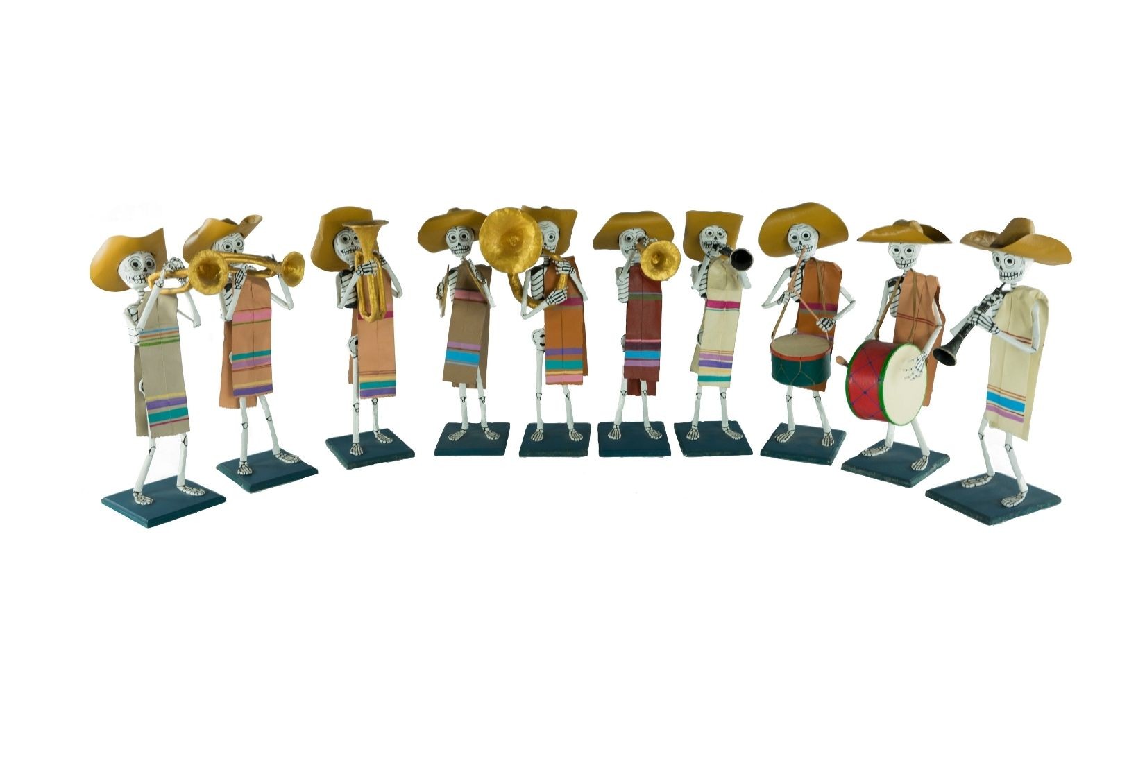 Calaveras enramadas, esqueletos encuartados o bailadores, cráneos con decorados multicolores, esqueletos de personajes del pueblo, catrinas y catrines, entierritos, procesiones, tumbitas, ofrendas, calaveras recortadas.
