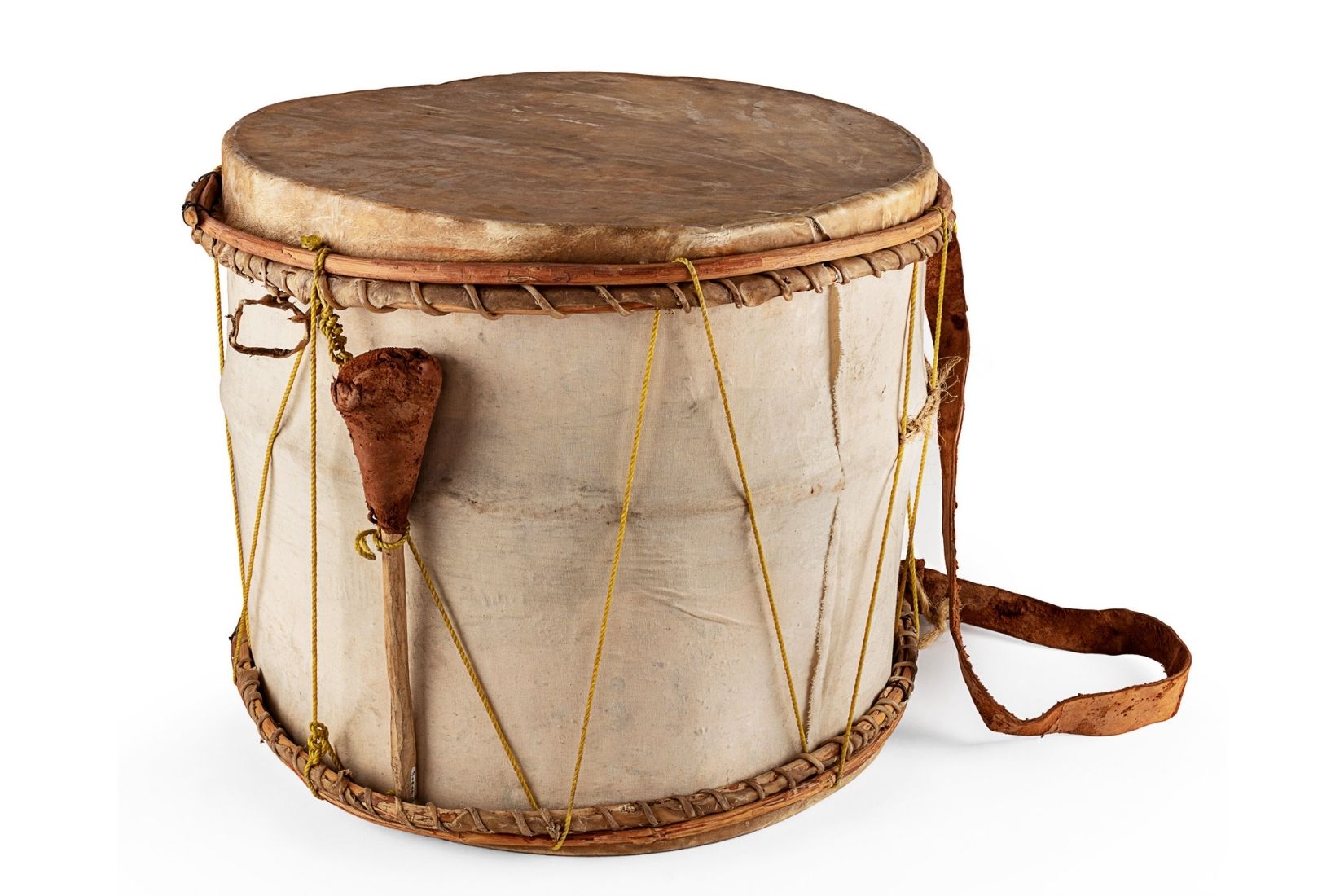 Tambor ceremonial cora de madera ahuecada. Cuero de res tensado, manta de algodón pintada y nailon. Artesano desconocido. Jesús María, Nay. 1970. Acervo del Instituto Nacional de los Pueblos Indígenas. D.R. Gerardo Landa / Estudio Michel Zabé, INPI.