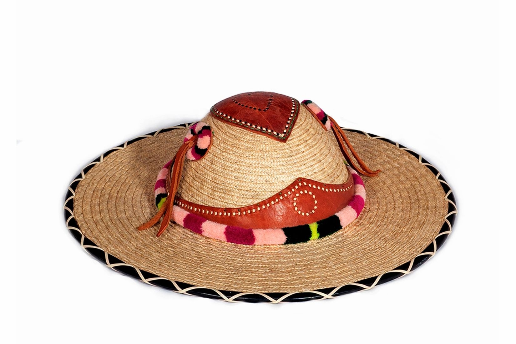 Sombrero tepehuano de palma tejida con aplicaciones de cuero, ribete de plástico y borlas de acrílico. Artesano desconocido. Santa María de Ocotán, Mezquital, Dgo. 2006. Acervo de Arte Indígena, Instituto Nacional de los Pueblos Indígenas. D.R. Jorge Moreno, INPI.