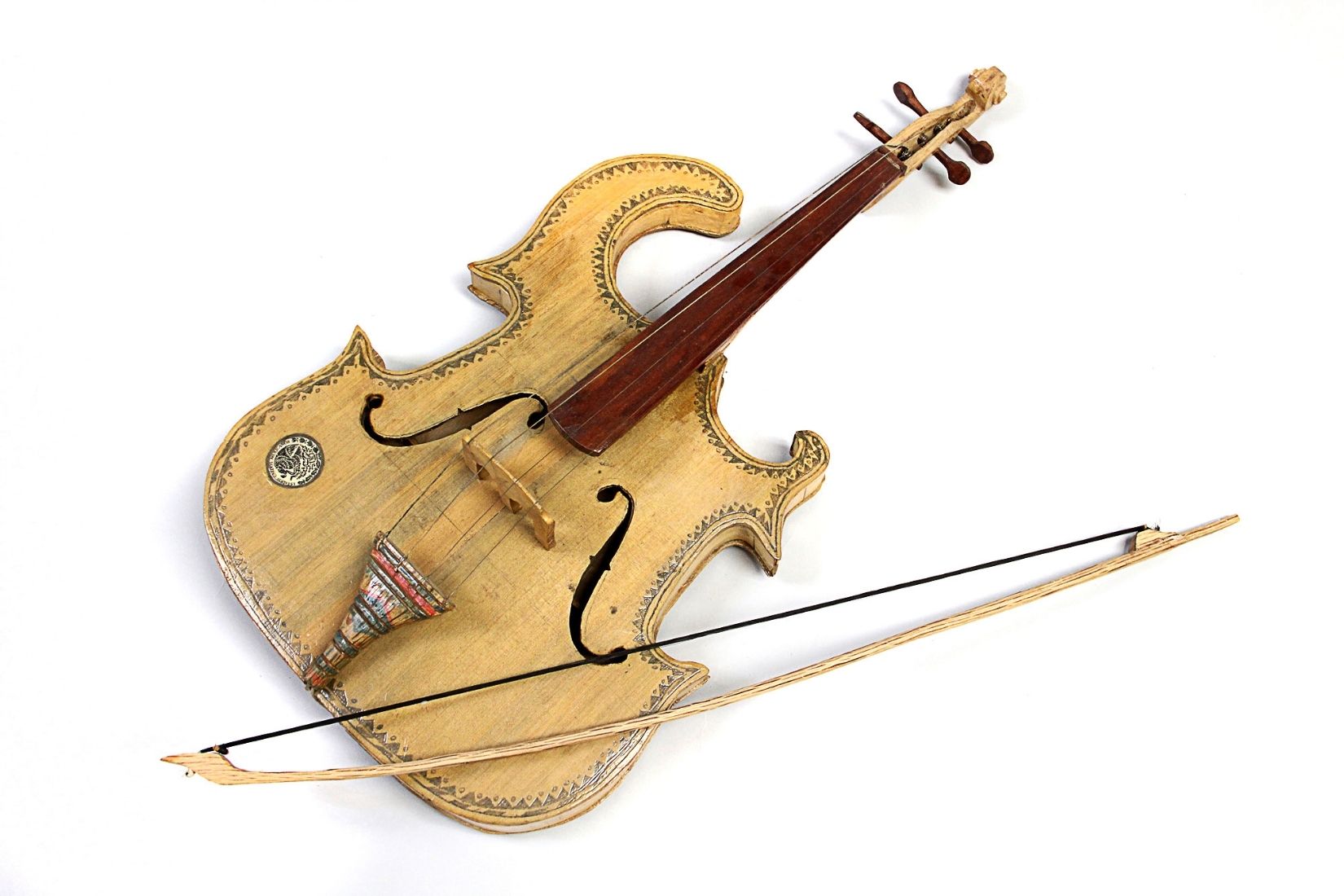 Violín de madera tallada y barnizada, cuerdas metálicas y cinta del arco de crin. Artesano Julio Ramos Castillo. San Bernardino de Milpillas Chico, Pueblo Nuevo, Dgo. Hacia 1980. Acervo de Arte Indígena, Instituto Nacional de los Pueblos Indígenas. D. R. Sergio Pérez, INPI.