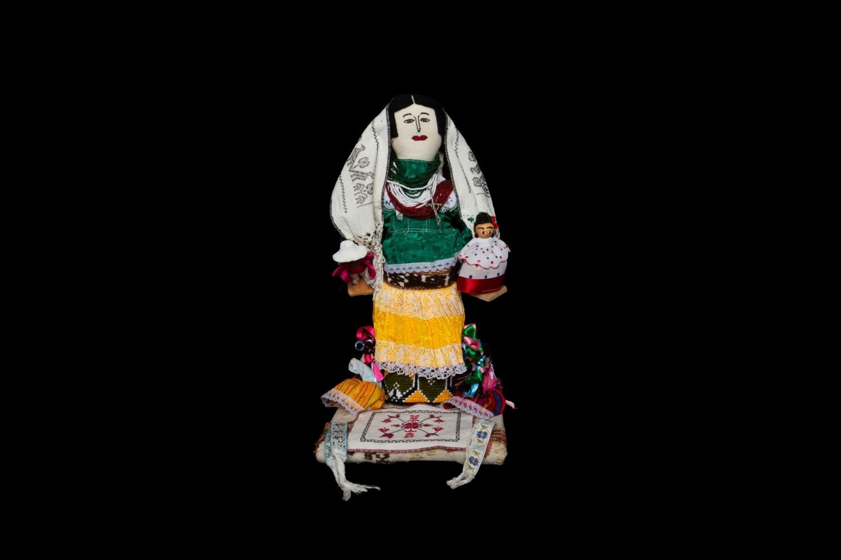 Muñeca mazahua de textiles bordados a mano y cosidos a máquina. Artesano Jan Cristhian Mata Ferrer. Valle de Allende, EdoMex. 2013. Donante Jan Cristhian Mata Ferrer. Col. AmigosMAP. (Foto: EKV).