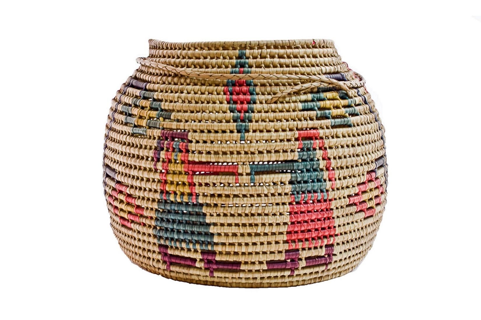 Cesta de palma real teñida con anilinas y tejida con técnica de cosido en espiral. Artesano desconocido. Santa Ana Tlapaltitlán, Toluca, EdoMex. Hacia 1950. Acervo de Arte Indígena, Instituto Nacional de los Pueblos Indígenas. D.R. Mariana Ortiz, INPI.