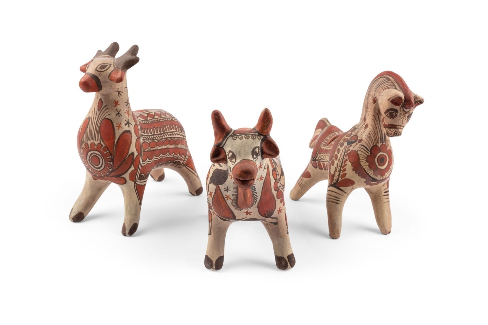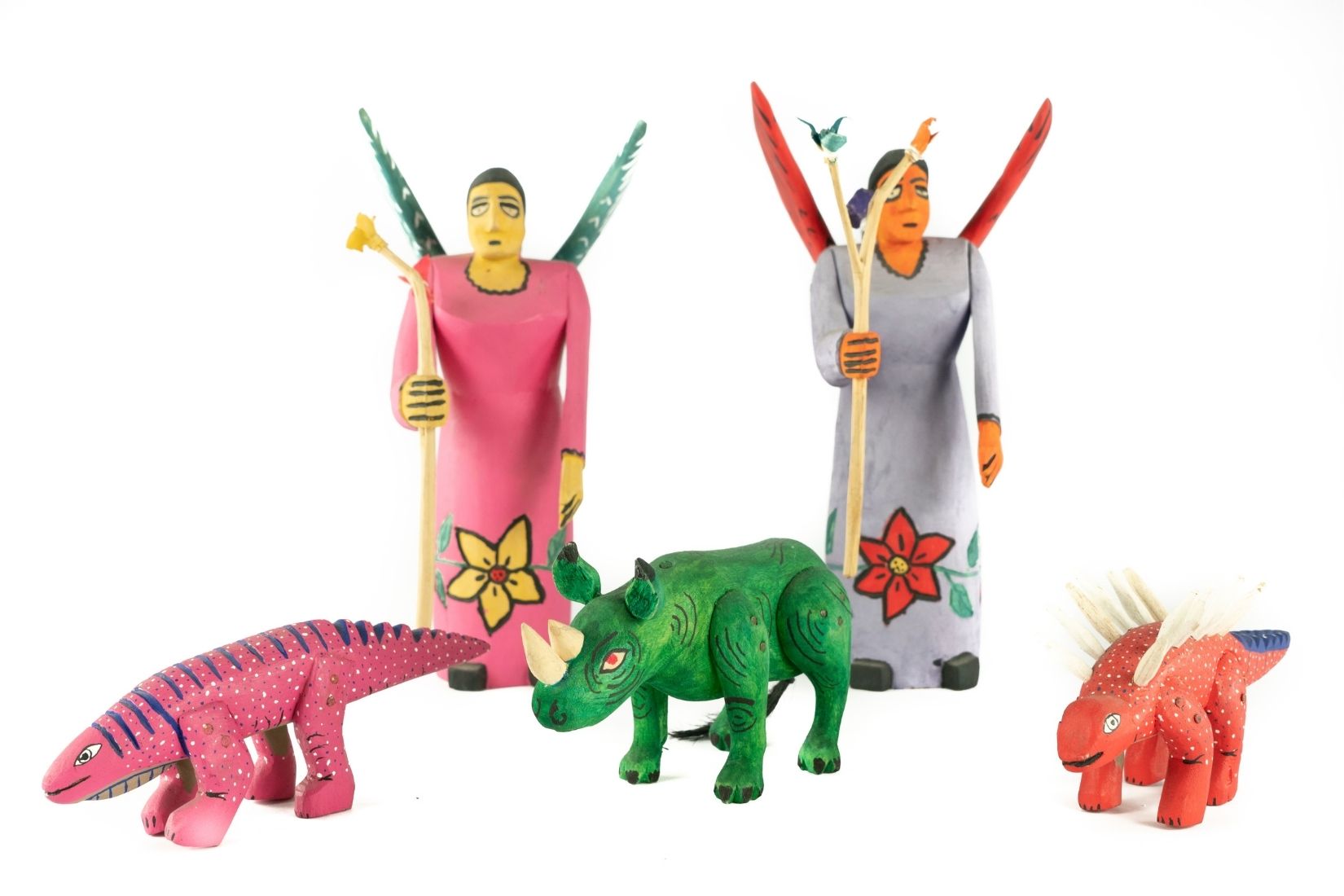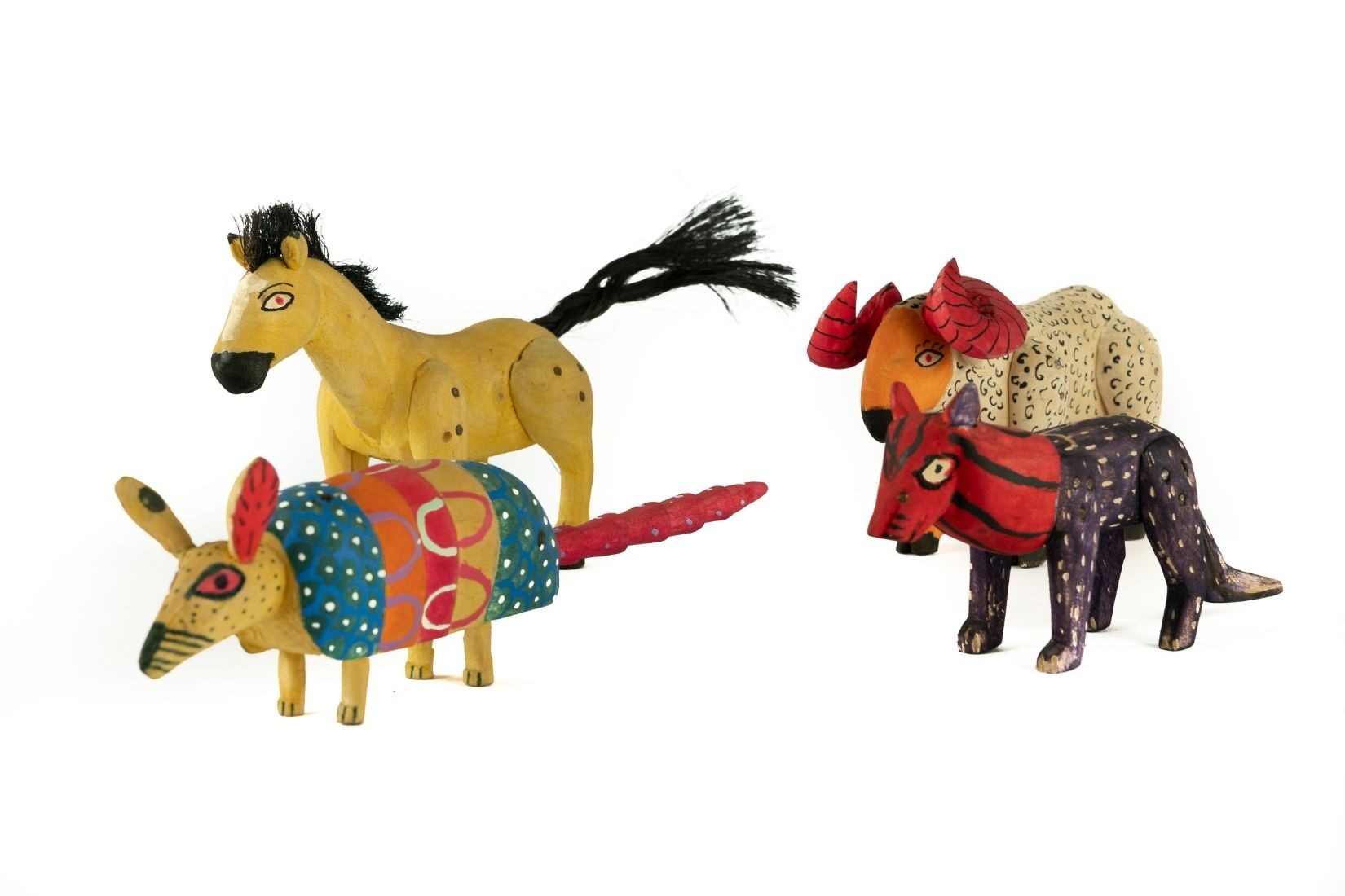 En otro de los grandes estados artesanales, Oaxaca, podemos admirar las tortuguitas de sonaja tipo prehispánico y otros animales de barro pintados al temple, que se producen en Jamiltepec; animalitos de barro rojo, trastecitos de barro verde; silbatos con forma de animales; ángeles-campanas, flautas, sirenas, tecolotes, y diversas figuras de barro negro bruñido y esgrafiado de San Bartolo Coyotepec; las muñecas “bordadas” creadas por Teodora Blanco, con aplicaciones de pastillaje, llenas de flores y animales fantásticos en su falda y entre sus brazos, en Atzompa y las escenas de la vida cotidiana: bodas, bautizos, velorios, etc., en barro policromado, de Ocotlán; las “Tangu Yuh” en Juchitán y Tehuantepec: muñequitas de barro hechas en molde y pintadas al temple con vivos colores sobre fondo blanco, que se regalan a las niñas el día primero de cada año. Arrasola y San Martín Tilcajete se conocen por su producción de animales de madera tallada y pintada con anilinas, y últimamente por sus figuras zoomorfas fantásticas, a la manera de los alebrijes de cartón.