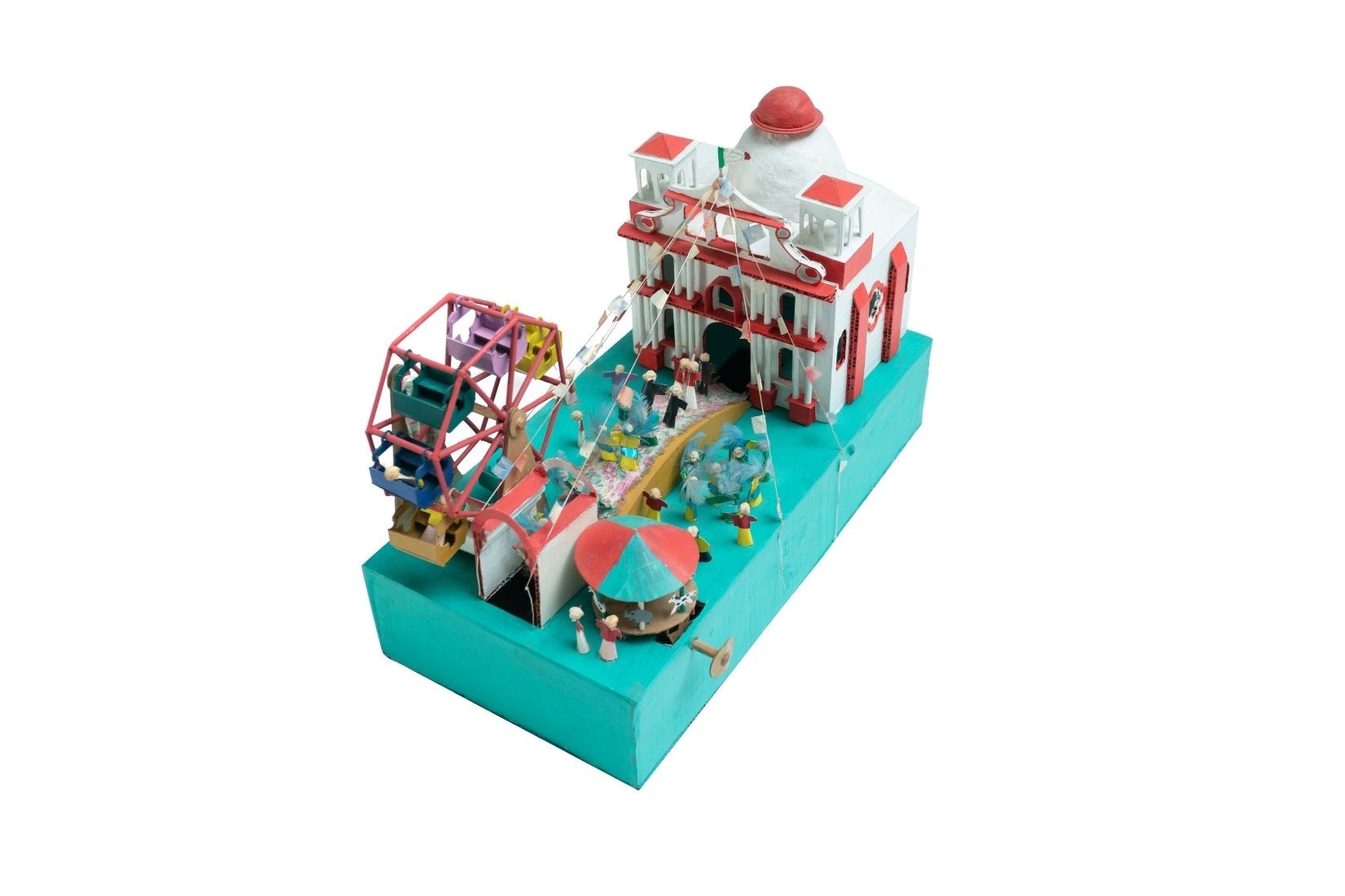 En miniatura: puerquitos de nueces ahuecadas en las que se coloca una mosca viva para que al aletear haga mover orejas y cola del animal; pulgas vestidas con cuerpo y ropa de ixtle coloreado, colocadas en parejas en pequeñas cajitas; juegos de té; copitas de plata, plomo y latón; miniaturas de vidrio estirado, a manera de filigrana: cisnes, candelabros, caballos, grupos de mariachis, carruseles, candiles, etcétera.
