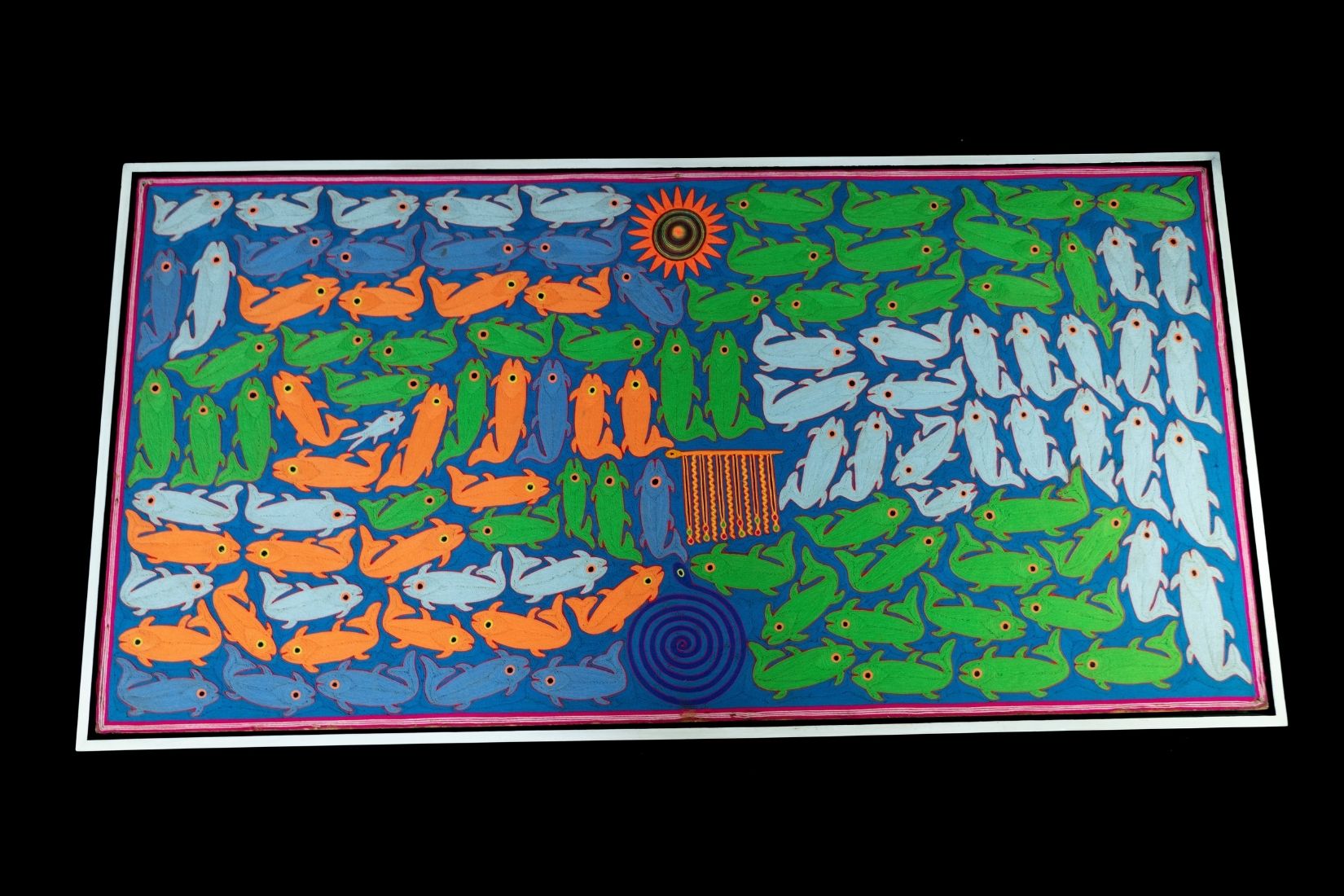 Tabla con motivos wixárikas o huicholes. Madera con chaquira y cera de Campeche. Artesano desconocido. Nayarit. Col. Miguel Abruch. (Foto: GLR Estudio).
