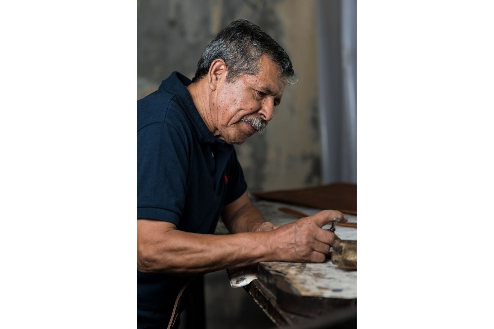 Artesano de piel cincelada, repujada y calada, Ismael Barrón de Monterrey, NL. (Foto: Fomento Cultural Banamex).
