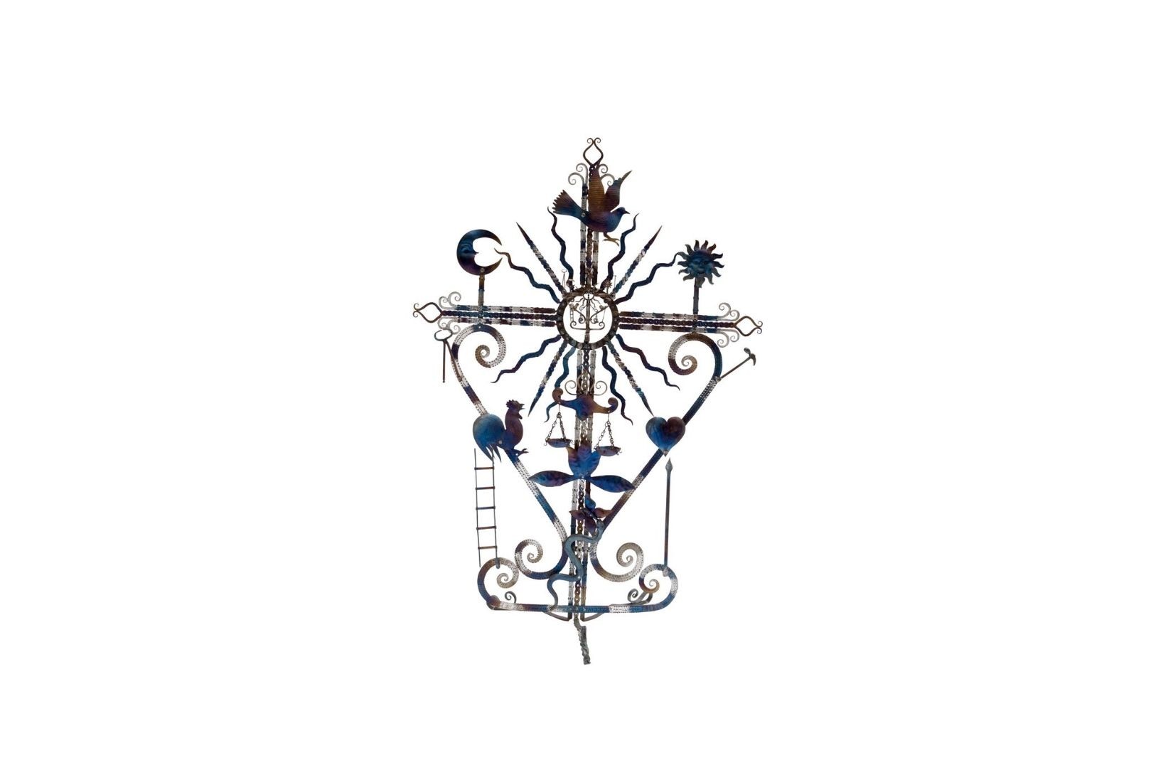 Cruz de hierro forjado con atributos religiosos y paganos. Artesano Guadalupe Hermosillo Escobar. San Cristóbal de Las Casas, Chis. 2005. Col. Fomento Cultural Banamex, pieza donada a AmigosMAP. (Foto: EKV).