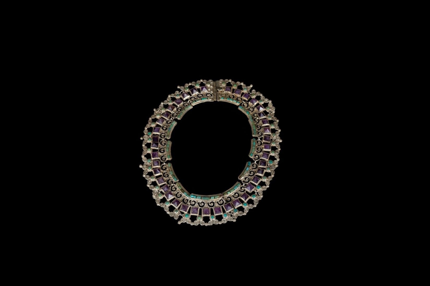 Gargantilla de alambre y granilla de plata e incrustación de piedras semipreciosas. Artesano y procedencia desconocidos. Col. Marie Thérèse Hermand de Arango. (Foto: EKV).