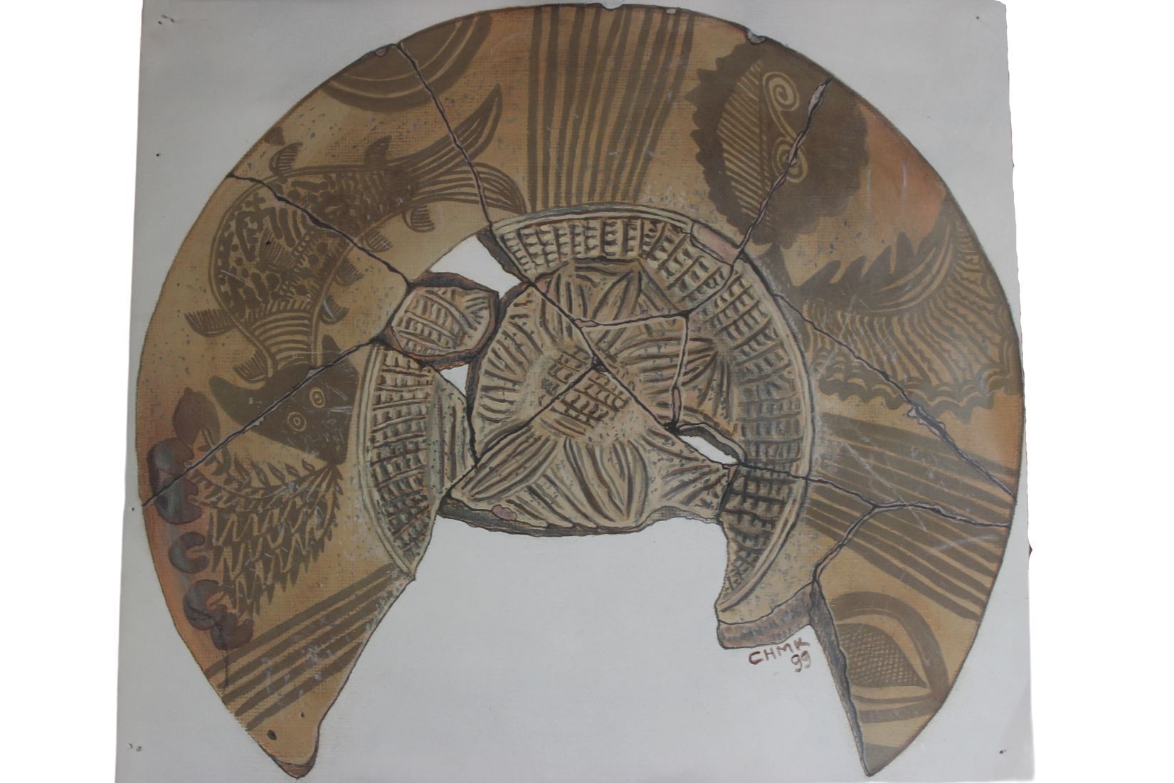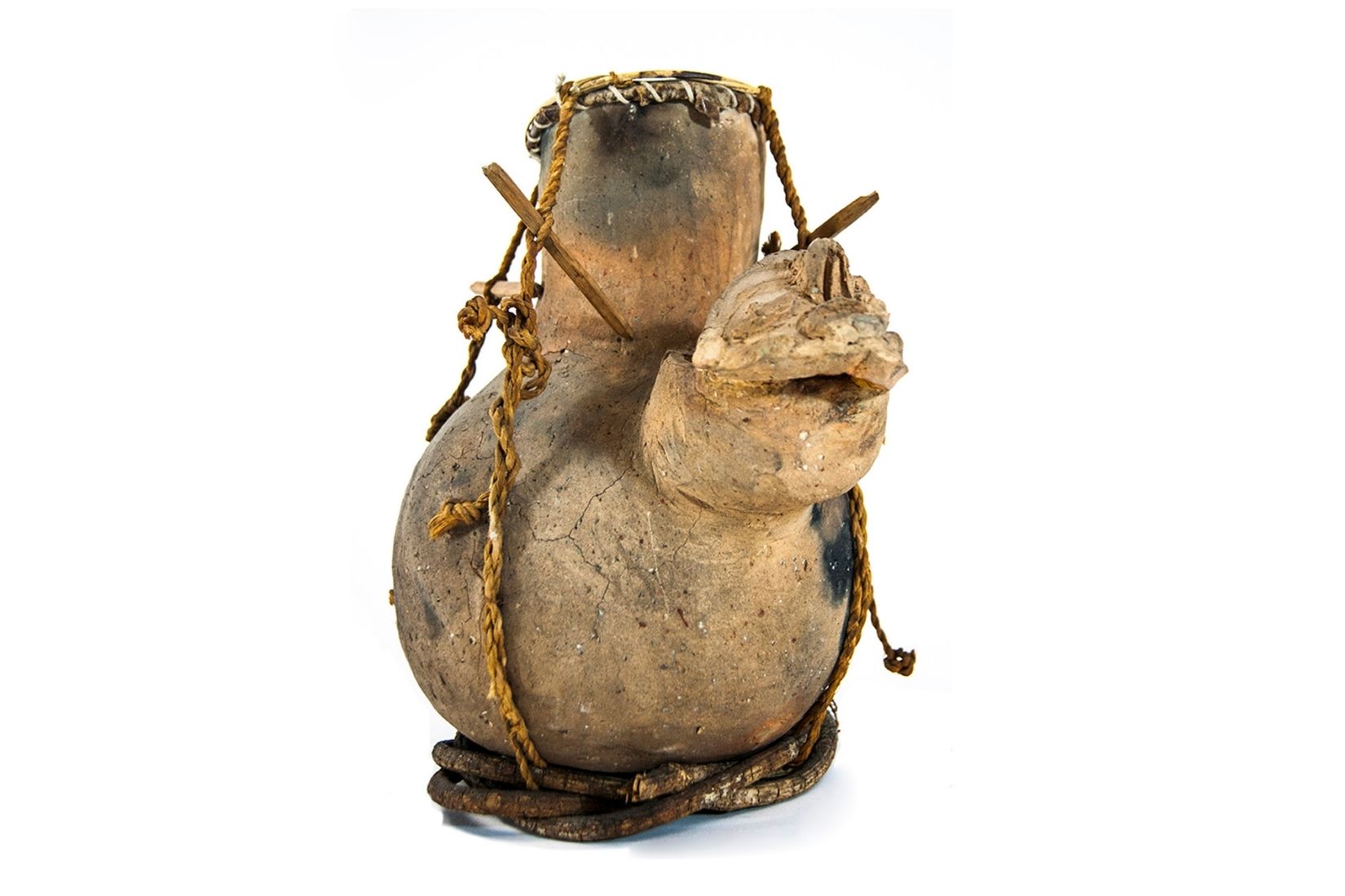 Kayum (timbal), en barro modelado y encalado, con cuerdas de ixtle y cuero tensado. Artesano desconocido. Instrumento lacandón de Nahá, Ocosingo, Chis. Col. INPI. D.R. Manuel Cristiani.